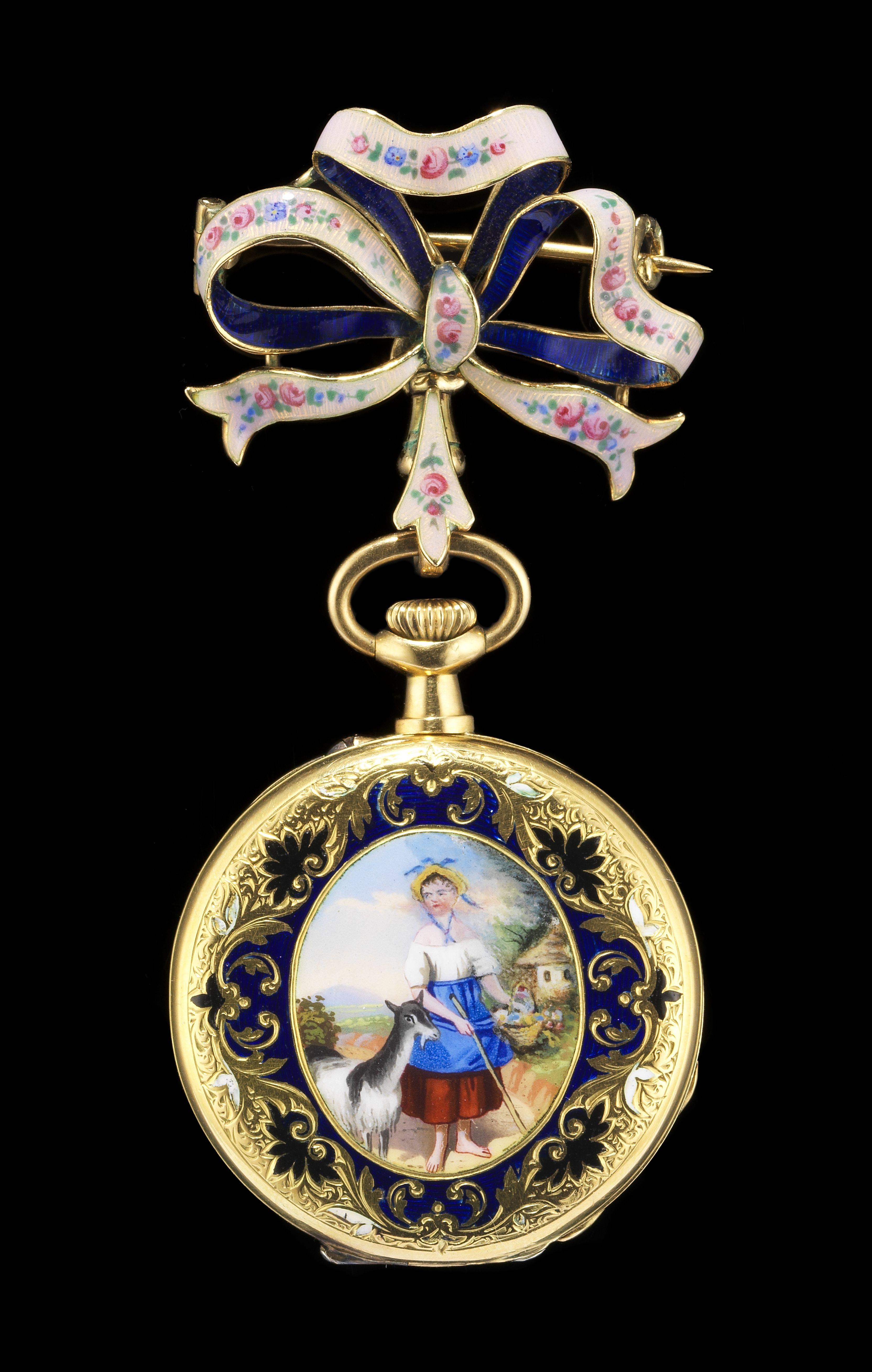 3600. Montre de poche ciselée à décor émaillé de bergère, retenu par une châtelaine à motif de nœud émaillé