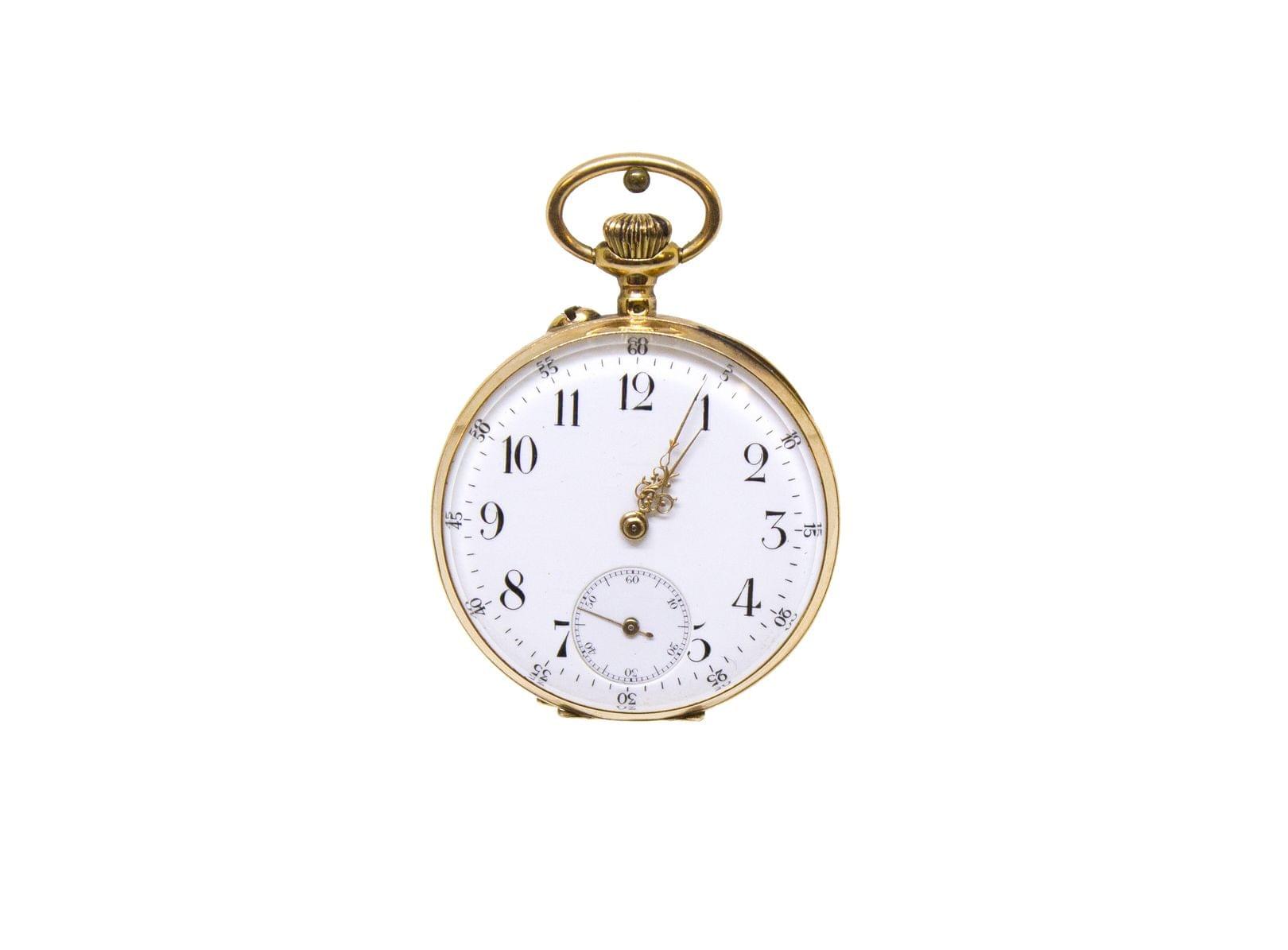 Cadran émaillé blanc, aiguilles dorées, chiffres arabes noirs, secondes à 6h, or 750, D 40 mm, poids brut 54 g