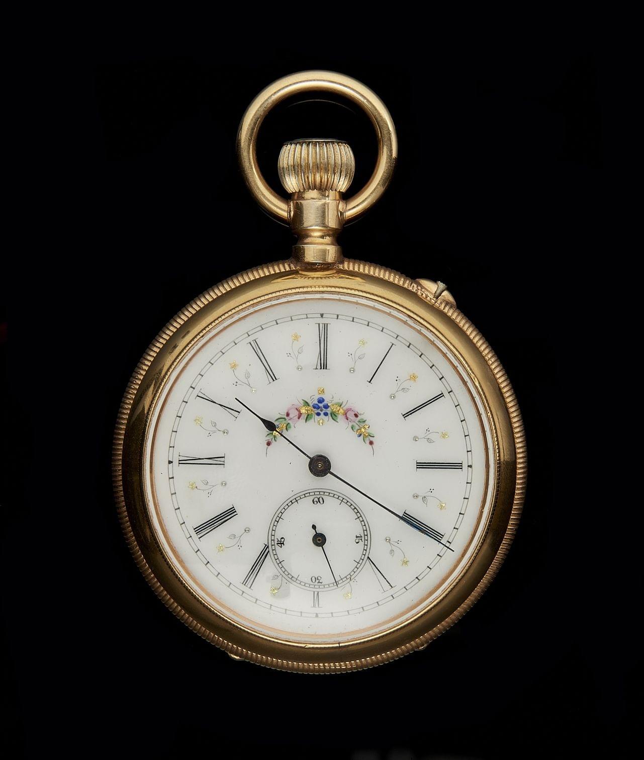 Cadran émaillé blanc centré d'un décor peint de guirlande de fleurs, aiguilles bleues, chiffres romains noirs, secondes à 6h, métal doré, D env. 56 mm