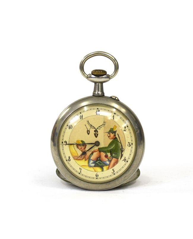 Cadran argenté, aiguilles bleues, chiffres arabes noirs, trois c...