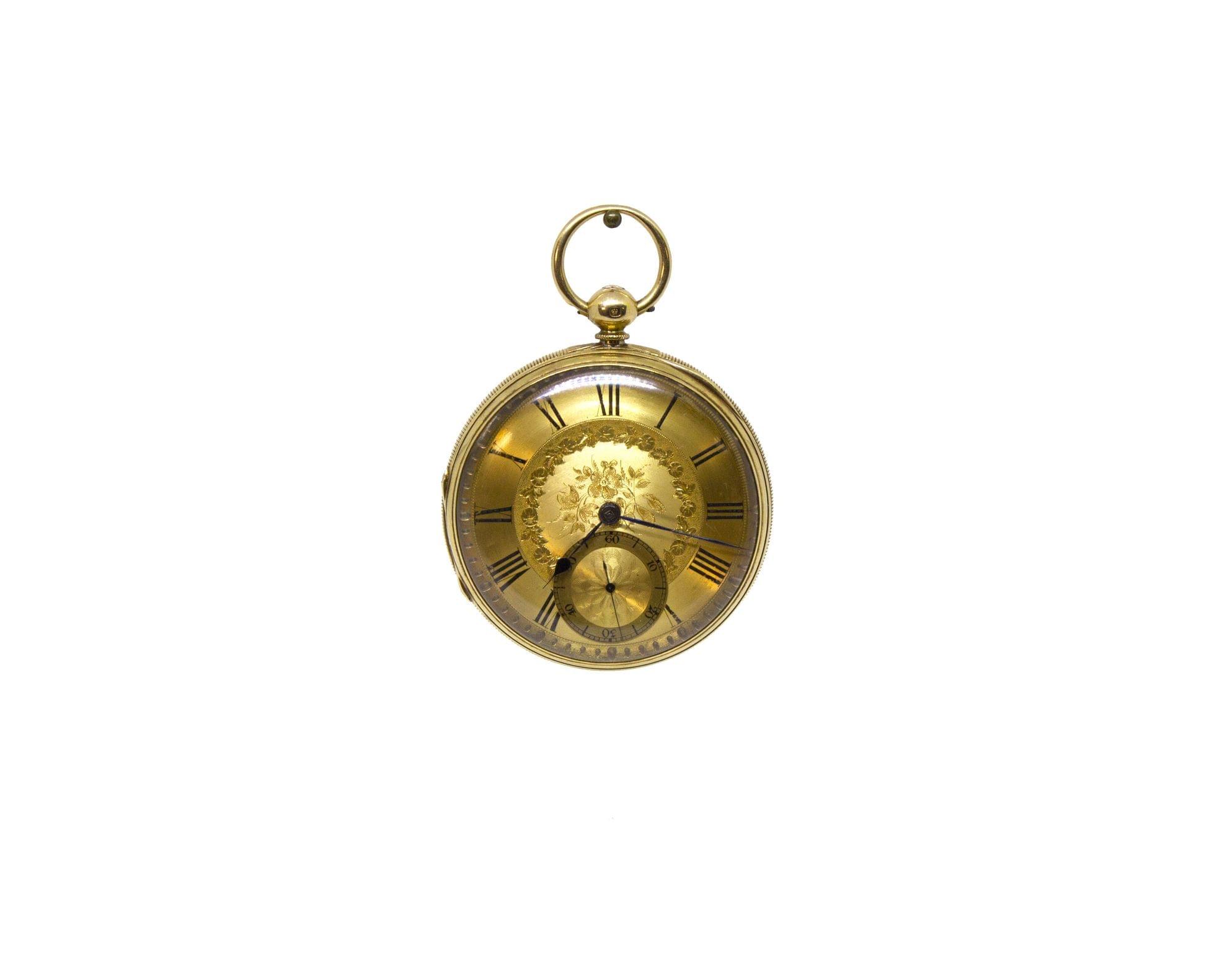 Cadran doré guilloché à décor de guirlandes fleuries, aiguilles bleues, chiffres romains noirs, secondes à 6h, travail anglais, or 750, D 48 mm, poids brut 101 g