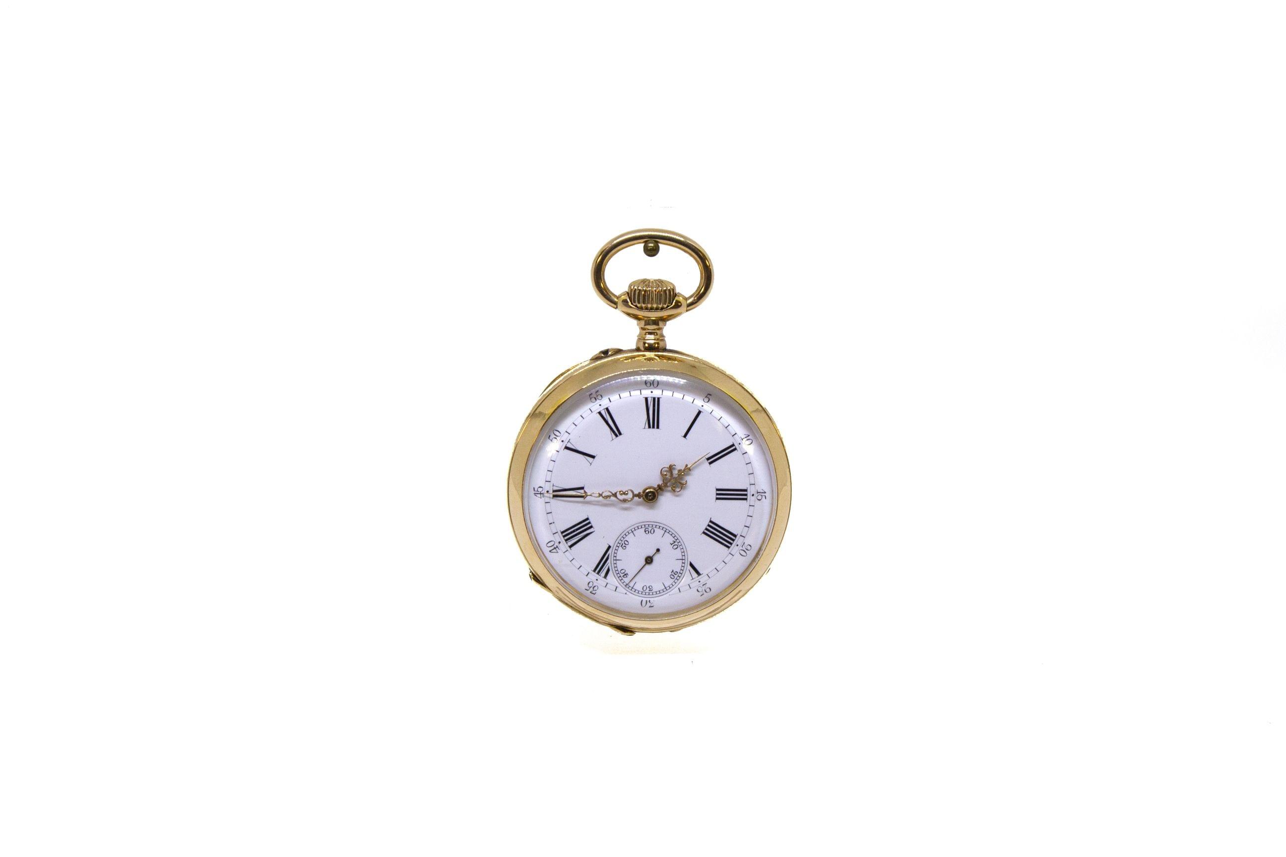 Cadran émaillé blanc, aiguilles dorées, chiffres romains noirs, secondes à 6h, circa 1890, or 750, D 47 mm, poids brut 76 g