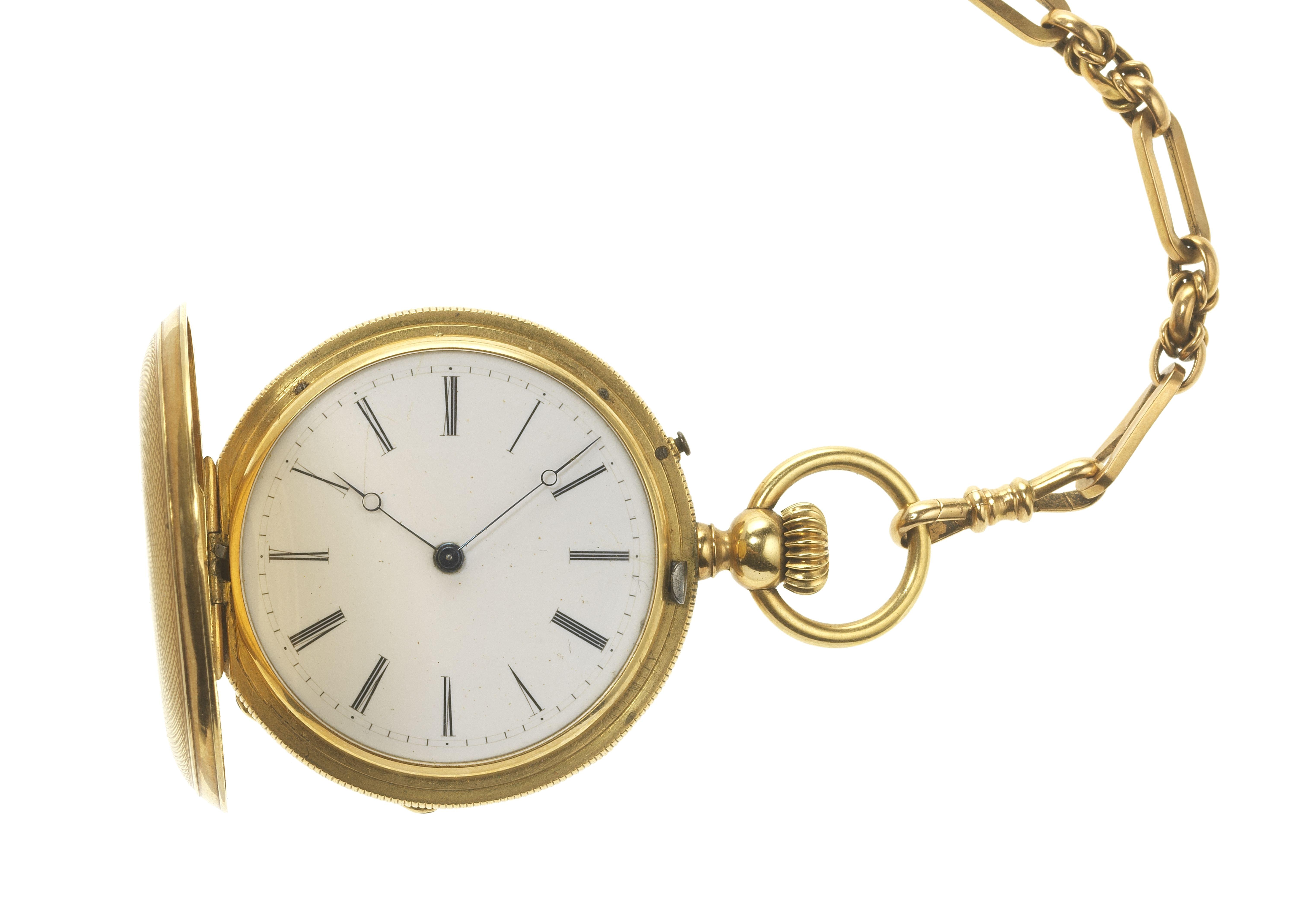 Cadran émaillé blanc, aiguilles bleues, chiffres romains noirs, or 585, D mm, poids brut 61 g, accompagnée d'une chaîne de montre en or 585, L 15 cm, 7 g