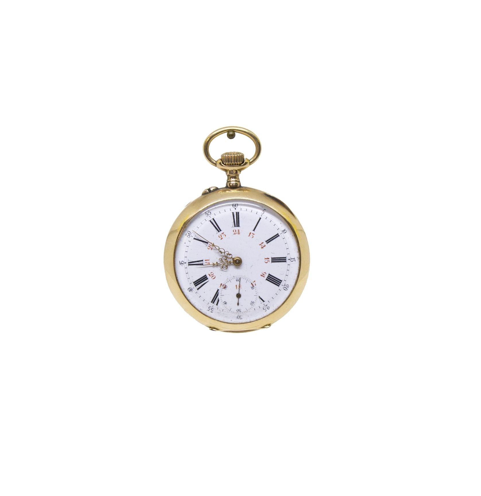 Cadran émaillé blanc, aiguilles dorées, chiffres romains noirs, secondes à 6h, or 750, D 46 mm, poids brut 77 g