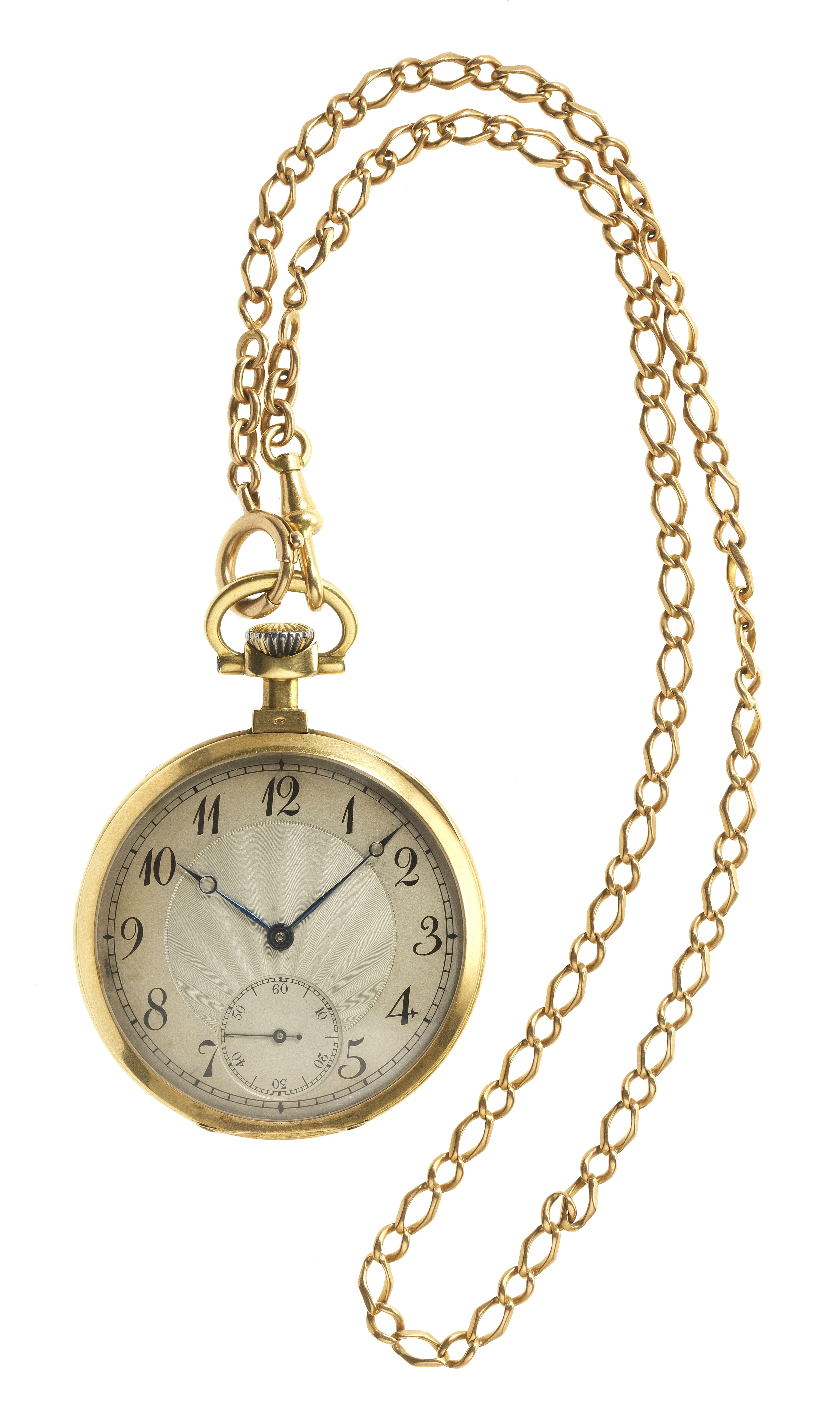 Cadran gris, aiguilles bleuies, chiffres arabes noirs, secondes à 6h, circa 1906, or 750, D 45 mm, accompagnée d'une chaîne de montre, poids brut 80 g, ne démarre pas