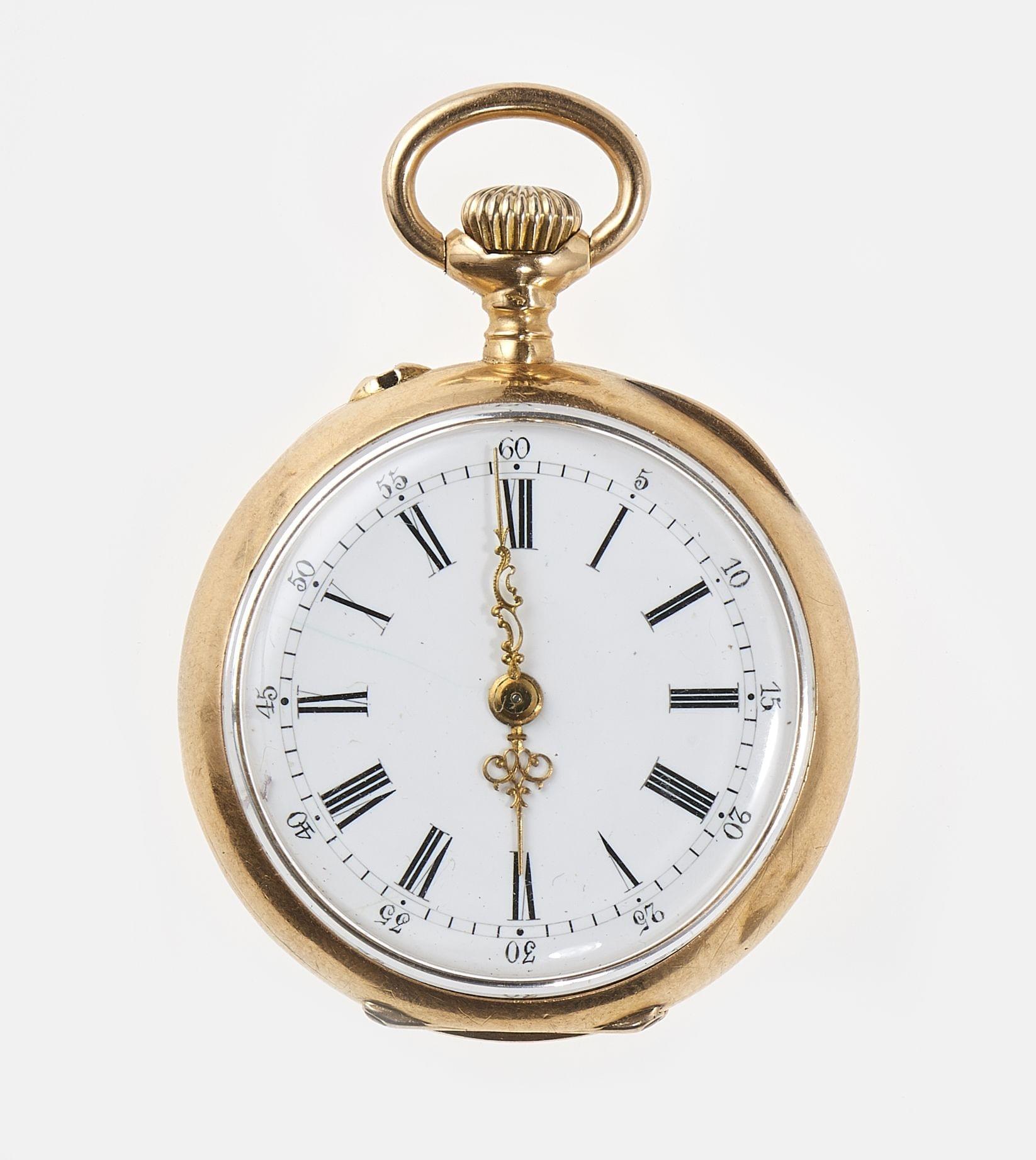 Cadran émaillé blanc, aiguilles dorées, chiffres romains noirs, or 750, D 30 mm, poids brut 23 g