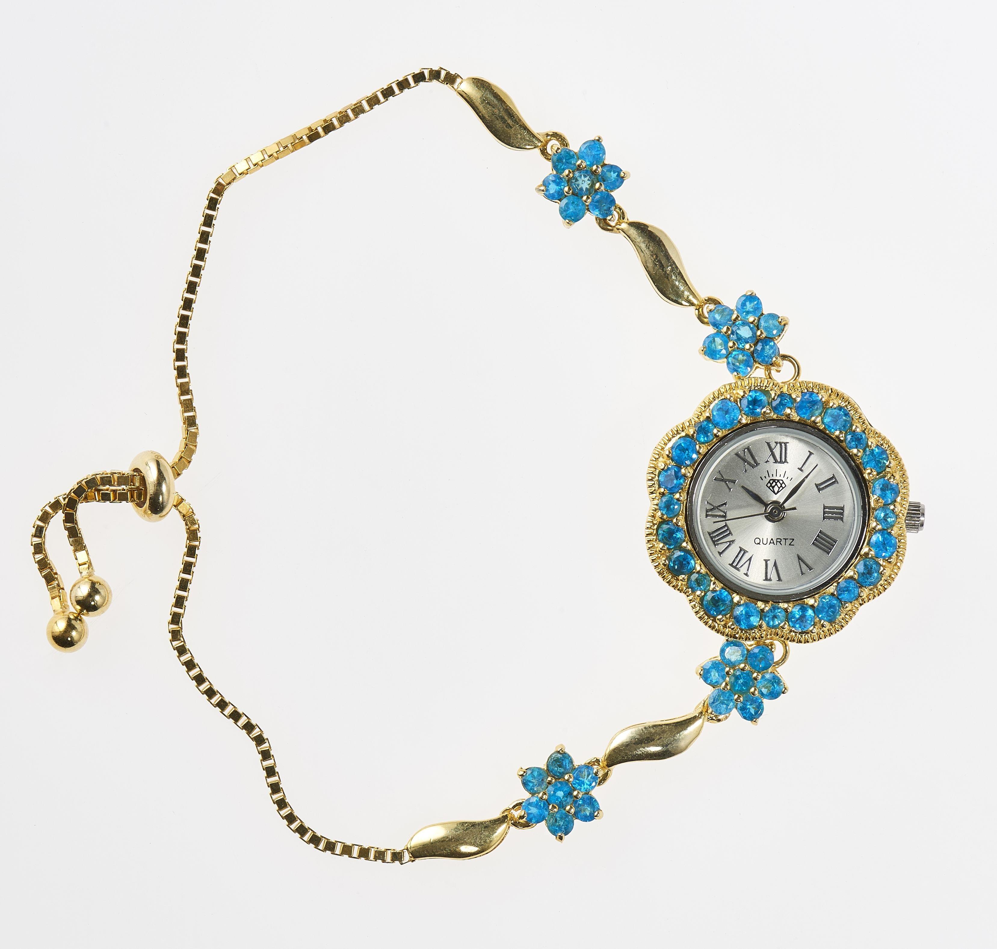 Cadran doré, aiguilles bleues, chiffres arabes noirs, secondes à...