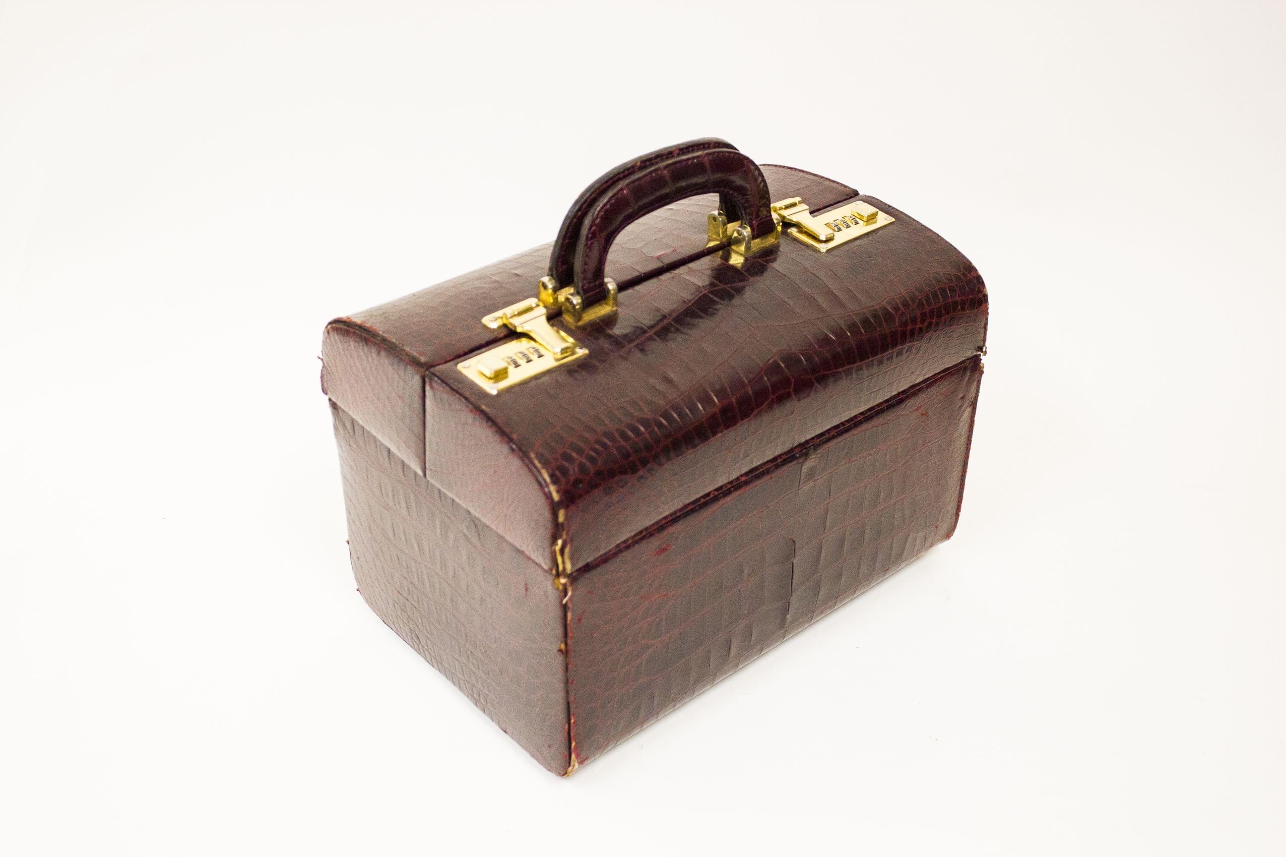 Crocodile bordeaux, garniture en métal doré, fermeture à code à trois chiffres, 24x35x24 cm