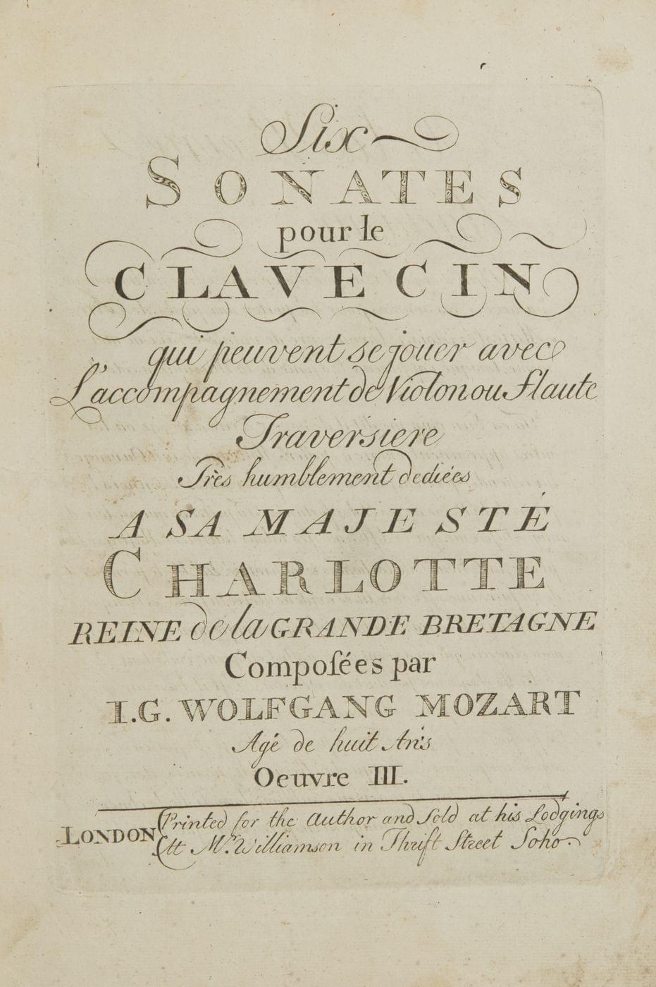 75. MOZART (Wolfand Amadeus) 1756-1791: Partition anglaise des Six Sonates pour Clavecin qui peuvent se jouer avec L'accompagnement de Violon ou de Flaute Traversière Très humblement dédiées à Sa Majesté Charlotte Reine de la Grande Bretagne Composées par I.G. Wolfgang Mozart Agé de huit Ans: Œuvre III.