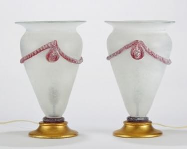 Verre givré blanc et cordon appliqué rouge, pied bois doré, H 41...