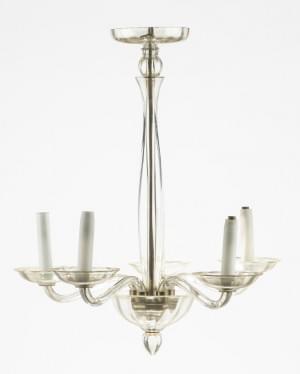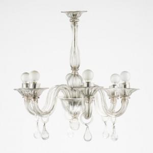 A 6 lumières, verre soufflé à décor de gouttes et d'anneaux, cir...