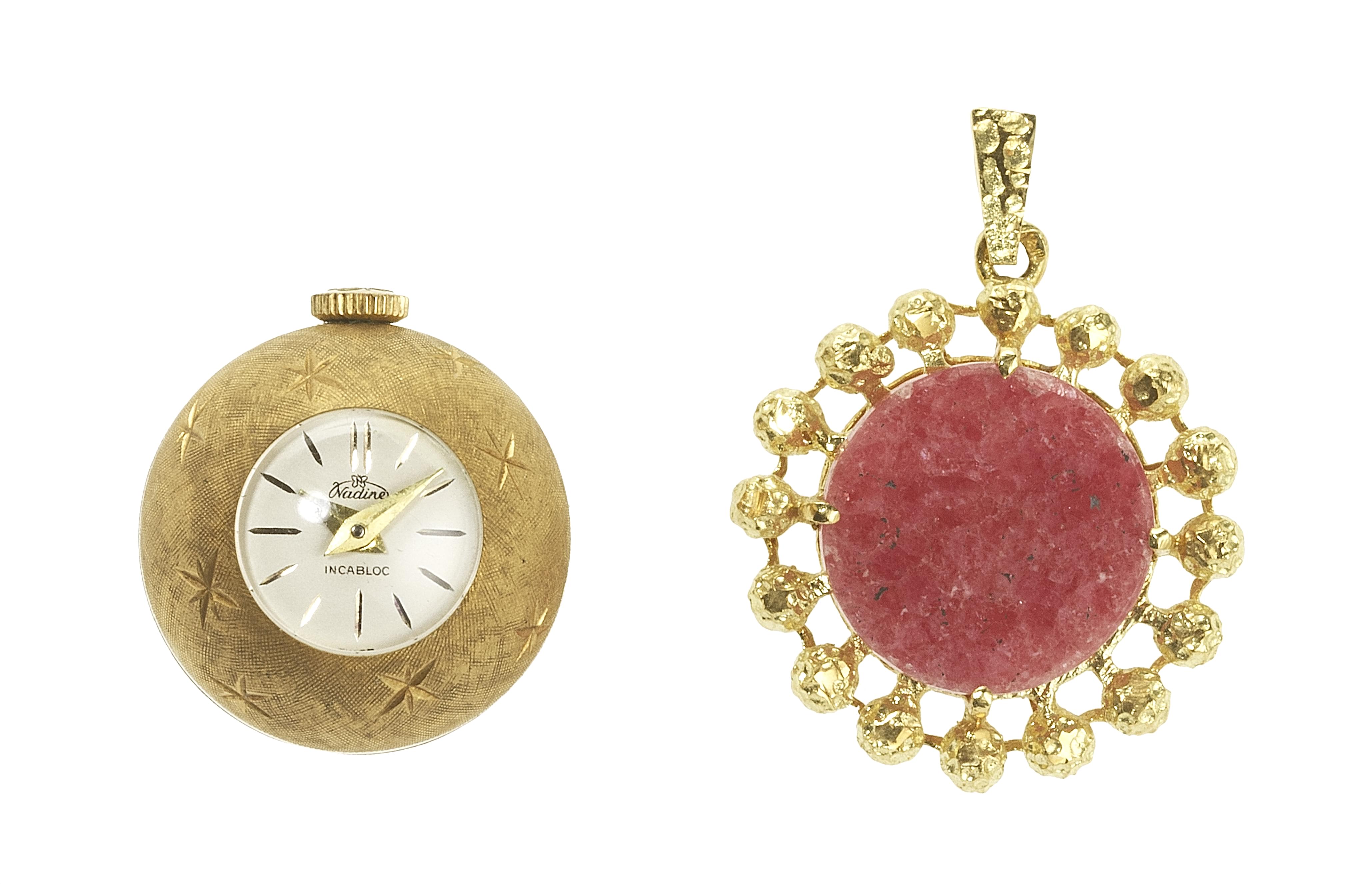 Cadran gris, aiguilles et index bâtons dorés, or 750, D env. 18 mm, poids brut 13 g. On joint un pendentif stylisé retenant une plaque de rhodonite en or 750, H env. 2,5 cm, poids brut 3 g.