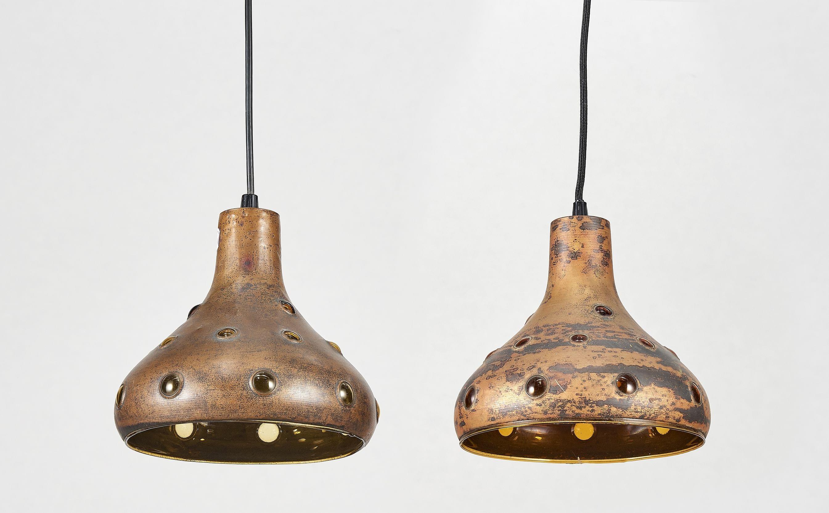 Paire de suspensions évasées, cuivre patiné et verre soufflé, 23x21,5 cm