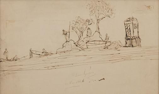 Etude de paysage avec personnages, encre sur papier, 20x34 cm. Provenance: collection Pernet-Villaverde