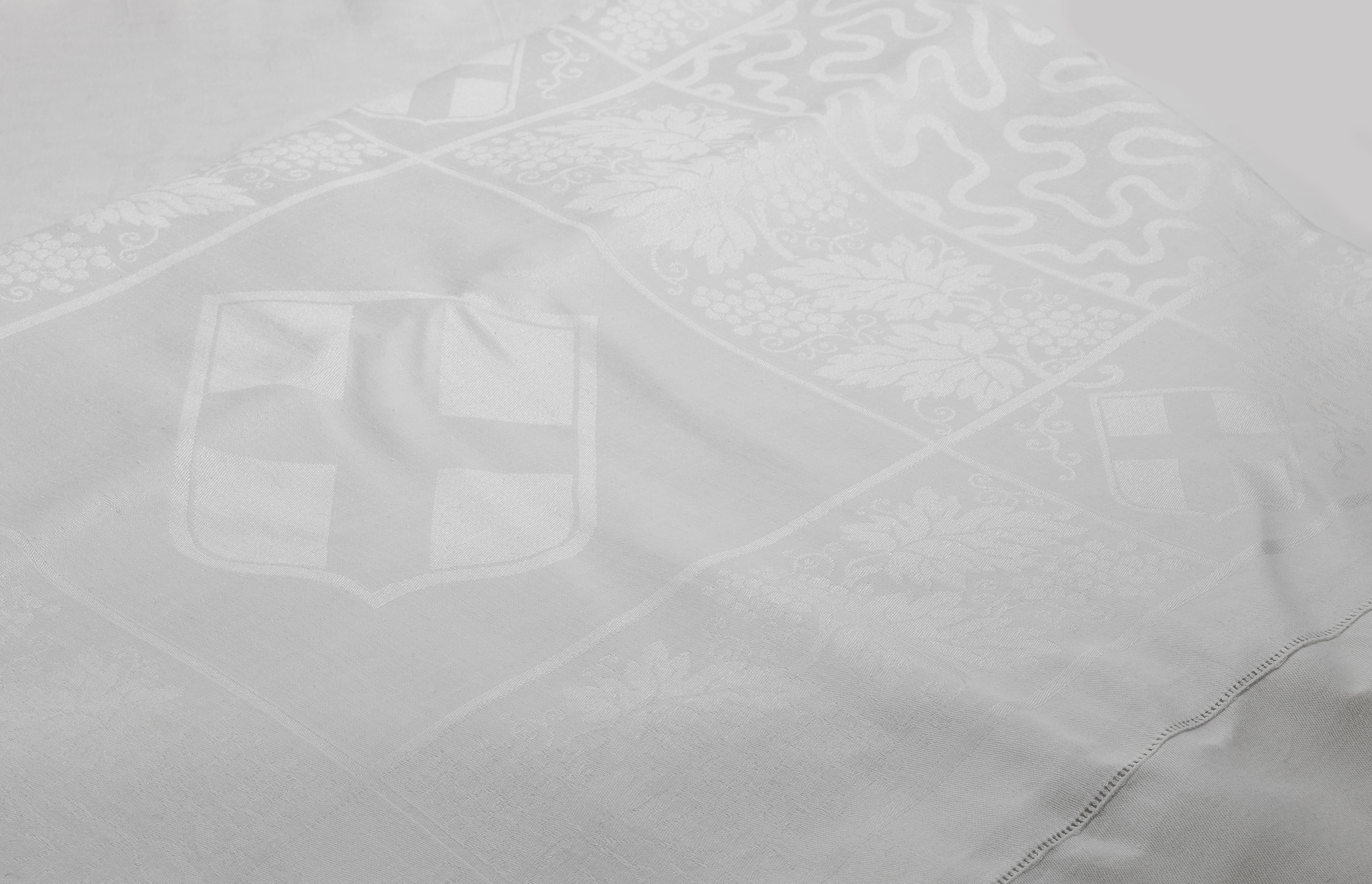 4117. Nappe damassée aux armes de Savoie et pampres de vigne, 360x360 cm.