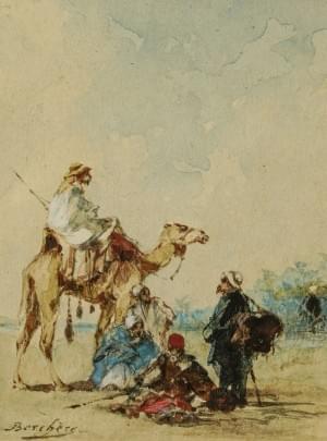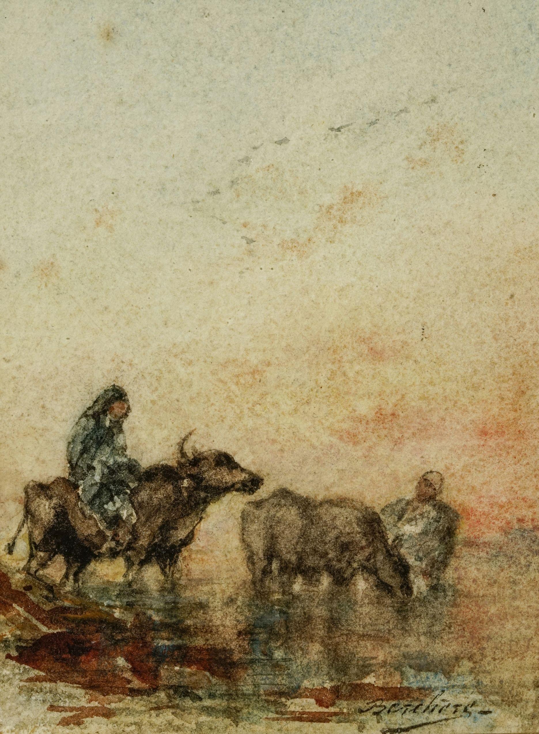 Bédouins et Bœufs à la rivière, paire d'aquarelles orientalistes, signées, 9,5x6,5 cm