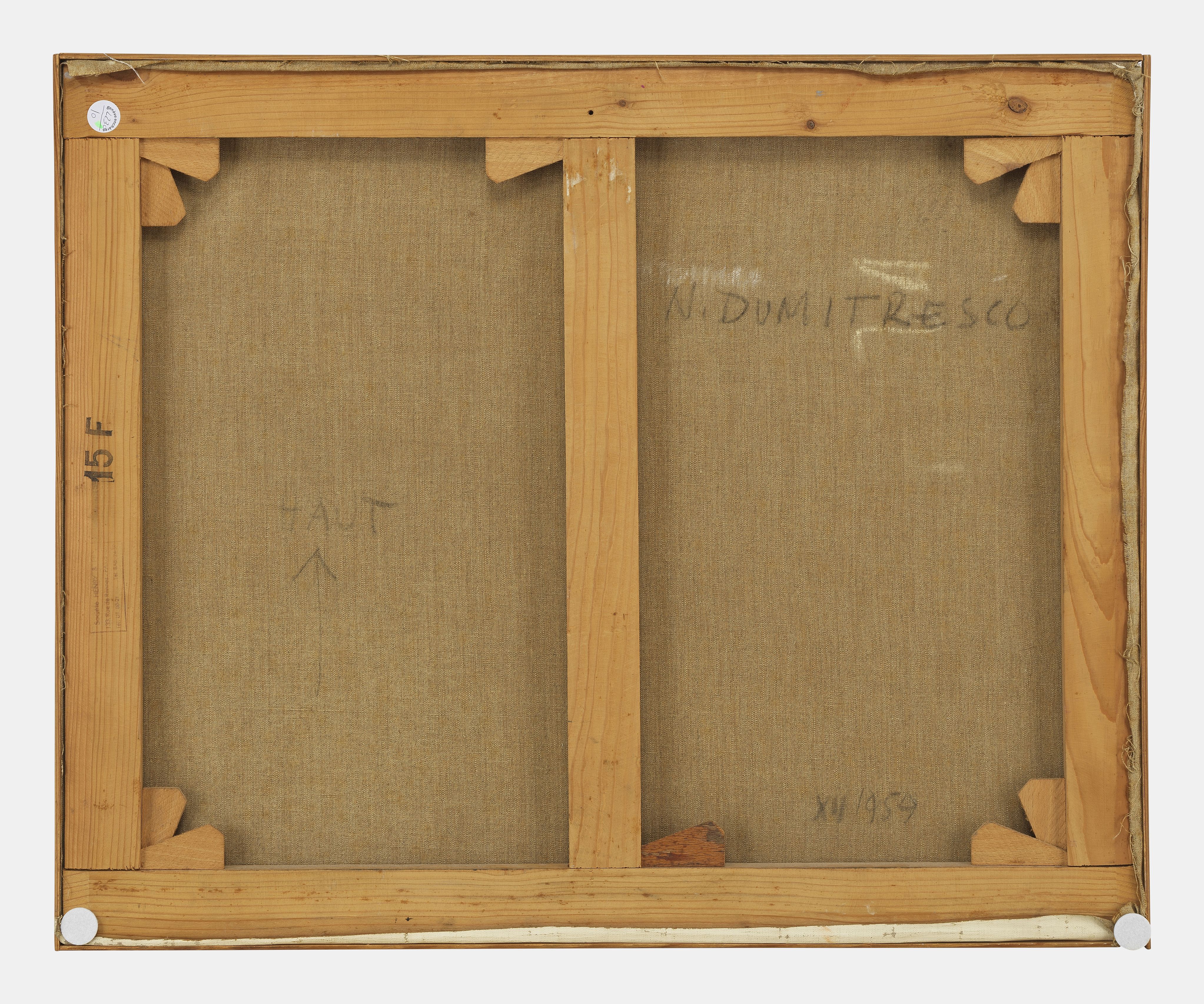Sans titre, huile sur toile, signée et datée au dos XII 59, 54x65 cm