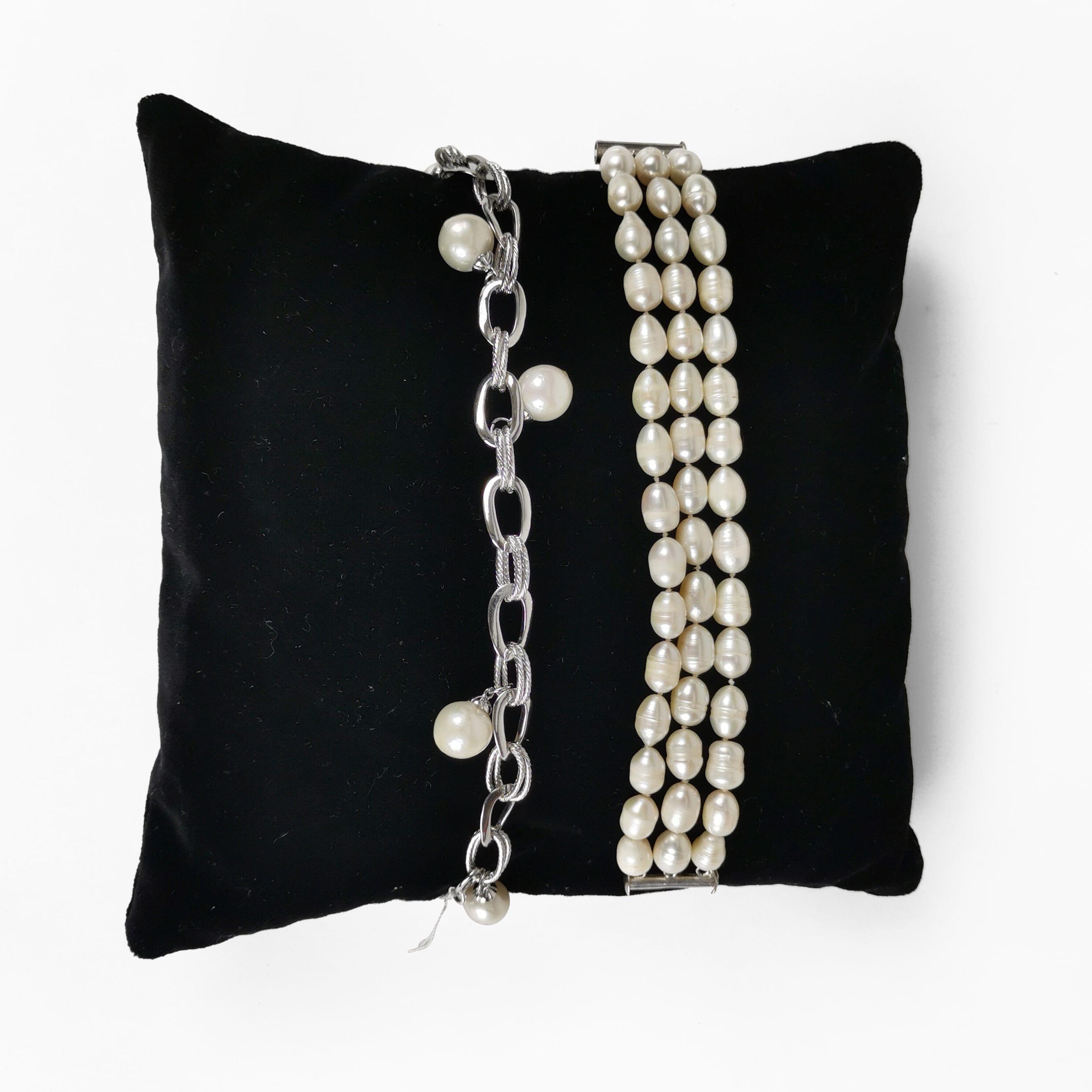L'un composé de trois rangs de perles d'eau douce et l'autre à maille stylisée ovale retenant des perles en pendeloques, métal, L 18 et 20 cm