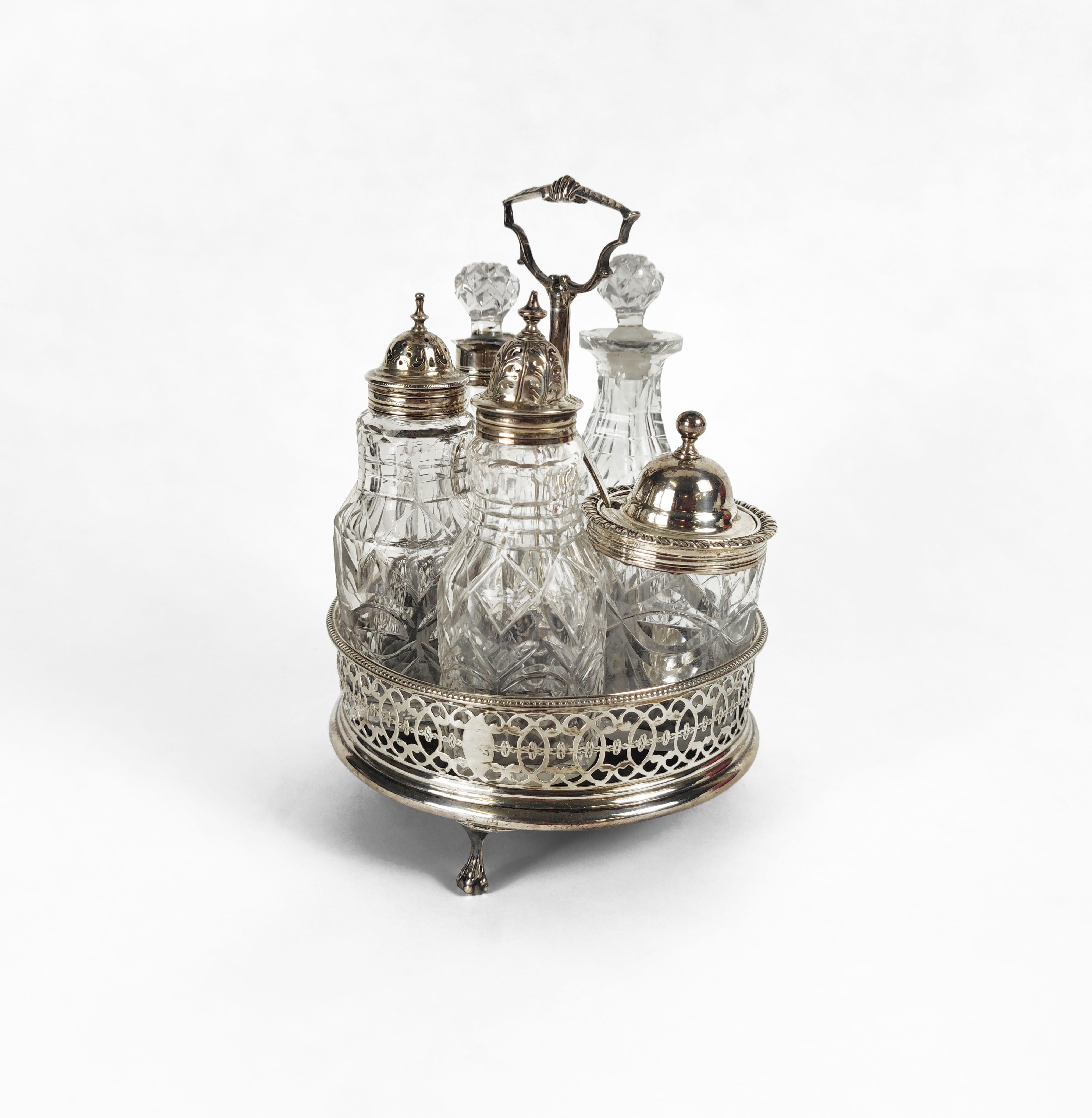 Londres, argent, verre et acajou, comprenant: plateau rond, deux flacons, deux saupoudroirs et un moutardier, H 20 cm