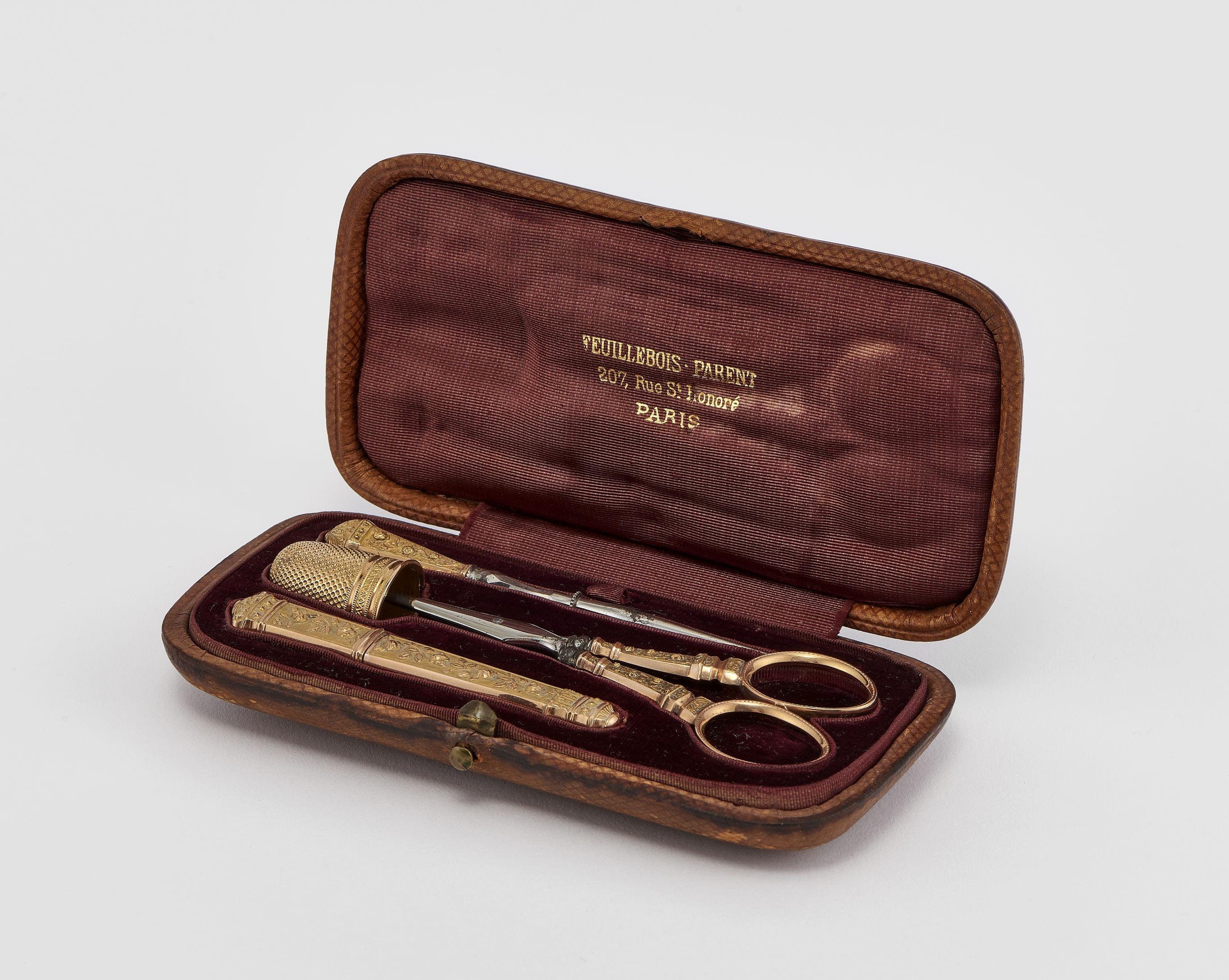 Ecrin Feuillebois, comprenant: étui à aiguilles, ciseaux, dé et poinçon, or 750 et métal, poids brut 26 g