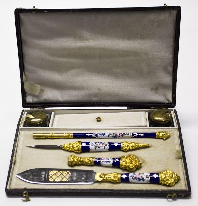 Métal doré et porcelaine émaillée polychrome dans un écrin, 4 pièces et deux encriers