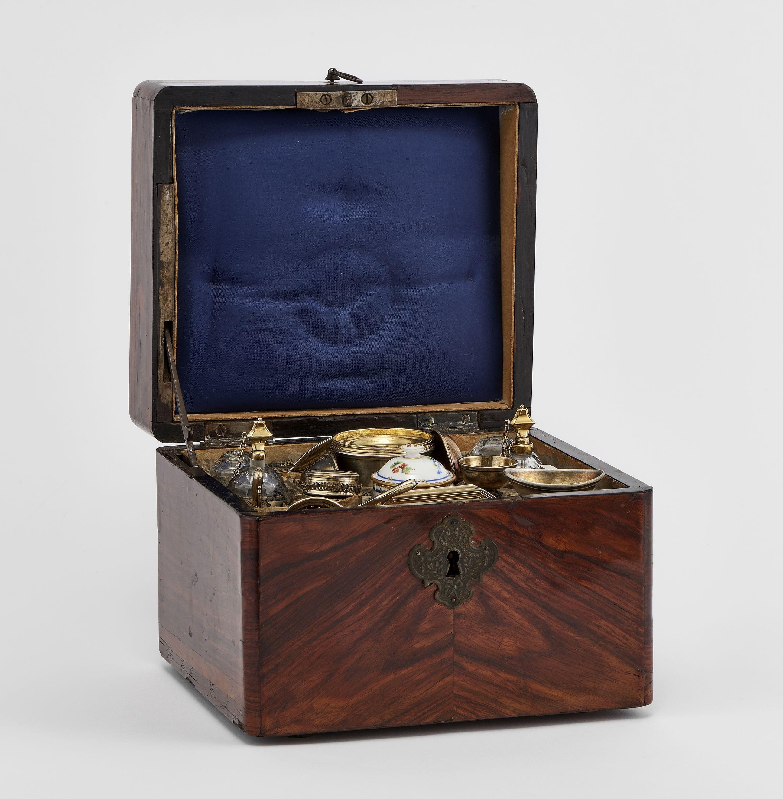 Ecrin en poirier noirci, comprenant: timbale, fourchette, cuillè...