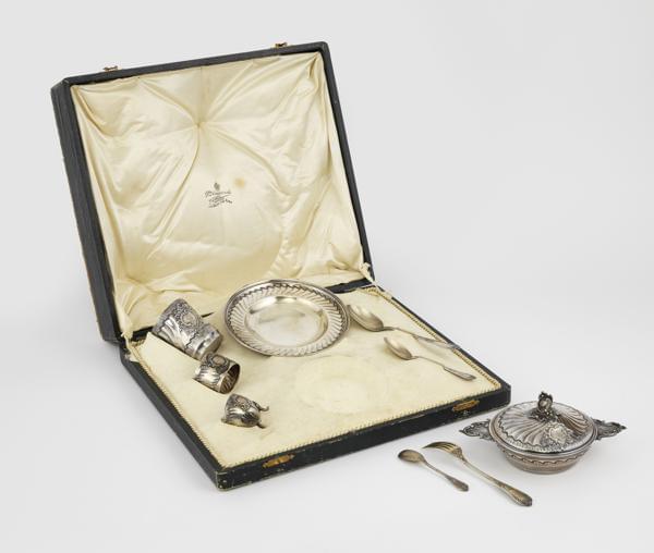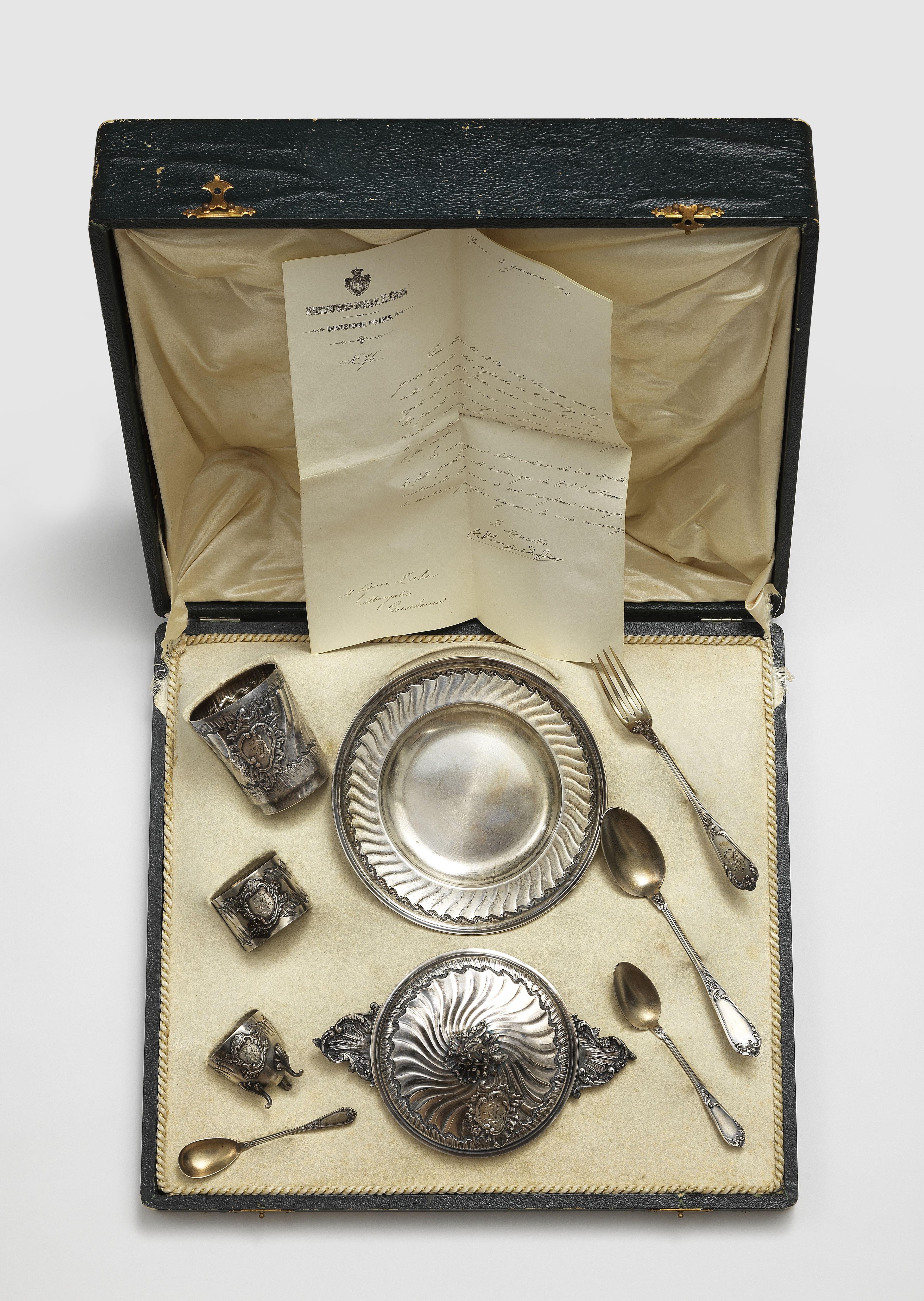 France, argent, comprenant: bouillon, assiette, timbale, lien de serviette, coquetier et couverts, 620 g. Cadeau de remerciement envoyé par sa Majesté au jeune Willy Zahn, âgé de trois ans, qui avait offert au roi un bouquet de fleurs des Alpes lors de l'arrêt de son train à Goeschenen dans le cadre d'une visite officielle en Suisse. Provenance: Collection Prince et Princesse de Savoie. Provenienza: Collezione Principe e Principessa di Savoia