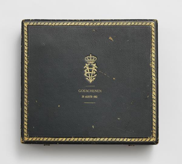 11. Nécessaire de voyage de style rocaille, chiffré WZ, dans un écrin au chiffre de Victor Emmanuel III et daté Goeschenen, 26 août 1902