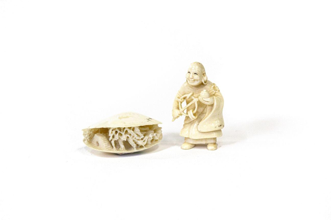 Ivoire, représentant un homme tenant un jouet et une coquille sculptée, H de 4,5 à 5 cm