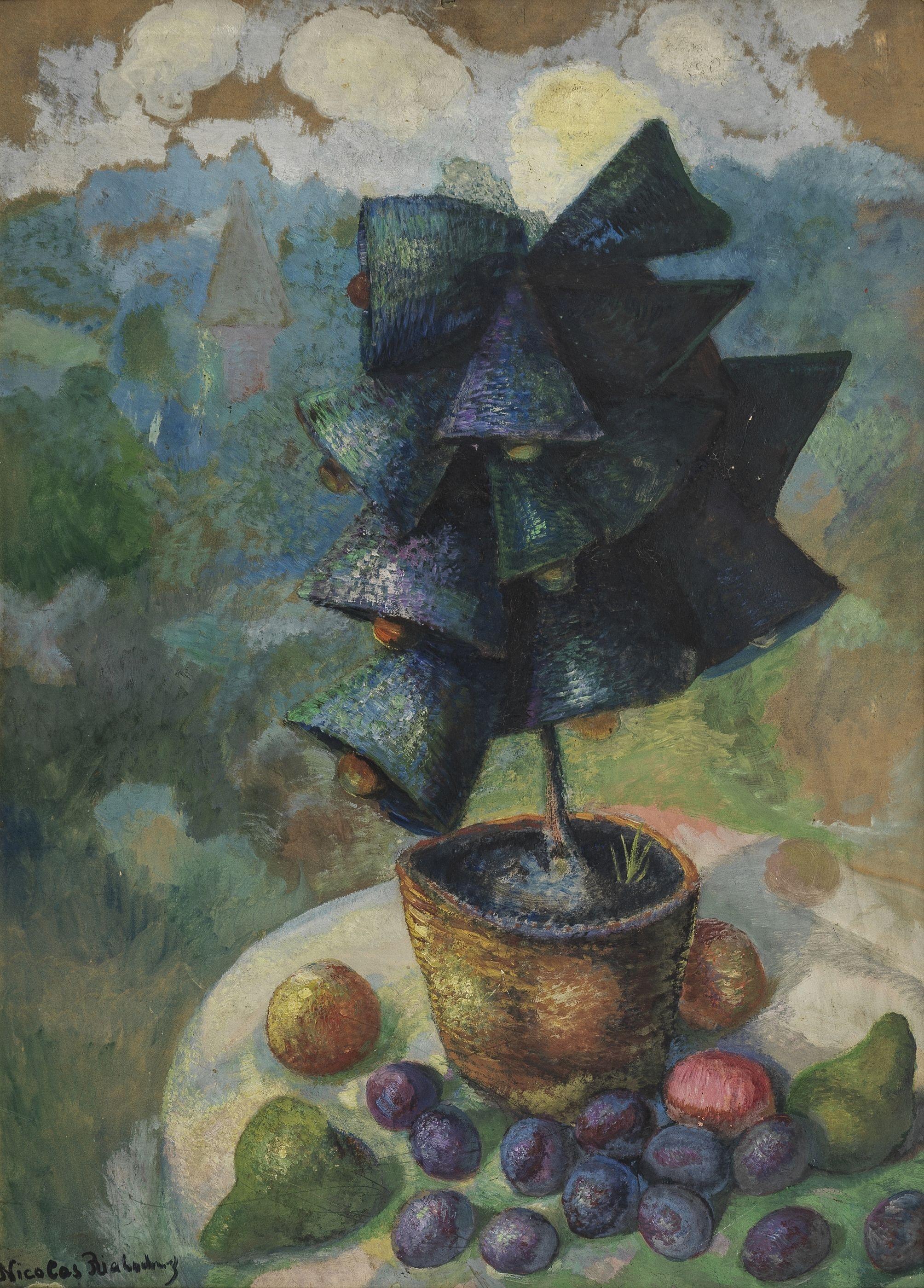 Clochettes de papier, huile sur carton, titrée et signée au dos, 70x50 cm
