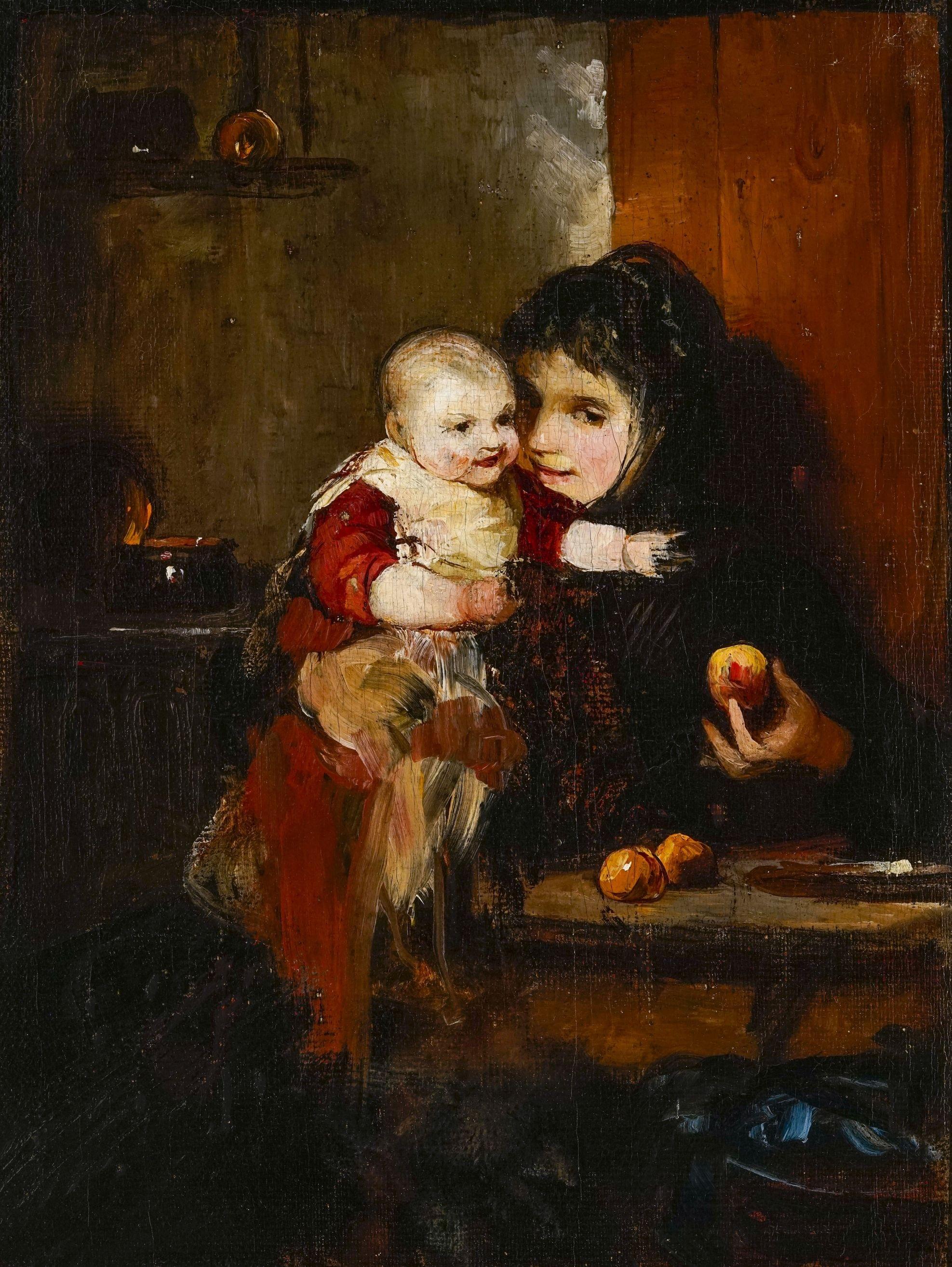 Mère et son enfant dans un intérieur, huile sur toile, 29x19 cm