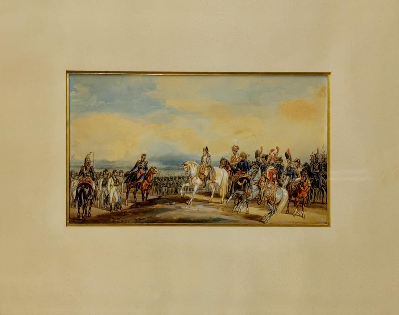 Napoléon passant ses troupes en revue, aquarelle sur papier, signée et datée 1840, 15x25 cm