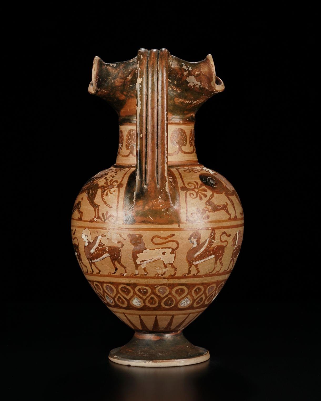 A décor sur deux frises, d'une scène de bataille et d'une procession de fauves et animaux fantastiques, terre cuite à figures noires sur fond rouge et rehauts de blanc, H 23,5 cm. L'ornementation du corps est typique de la céramique étrusque contemporaine. Elle met en scène des guerriers grecs reconnaissables à leur casque corinthien et leur bouclier circulaire combattant avec succès leurs adversaires habillés seulement d'un pagne et coiffés eux d'un bonnet phrygien. Provenance: Collection privée suisse