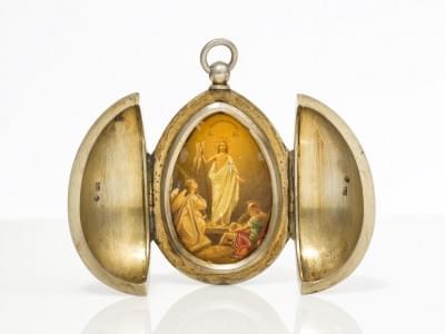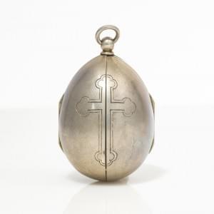 146. Oeuf de Pâques amati gravé d'une croix latine trilobée et de l'inscription "Христос воскрес" (Christ est ressusité) ouvrant sur une icône de la Résurrection du Christ à l'huile sur cuivre,orfèvre MИ,, Russie, 1908-1920, argent, H 8 cm, 150 g