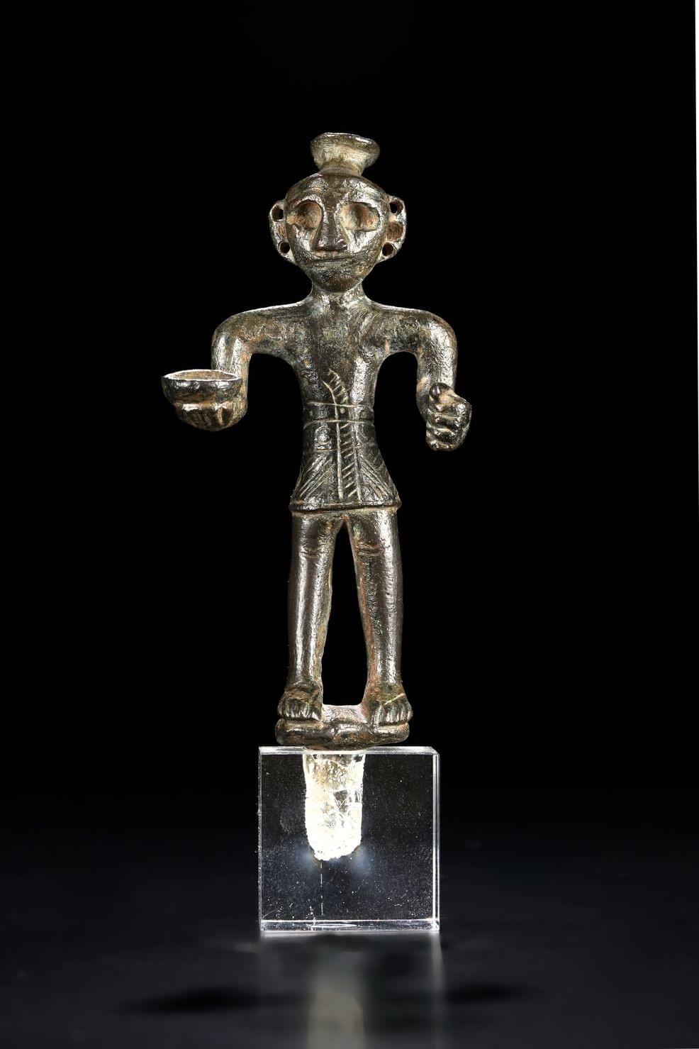 A canaanite bronze figurine of a man holding a libation bowl, end of 2nd millenium B.C. Provenance: Swiss private collection