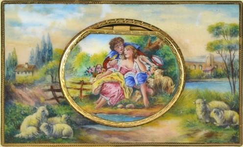 Métal doré et émaux à décor dans le style du XVIIIe de scènes pa...