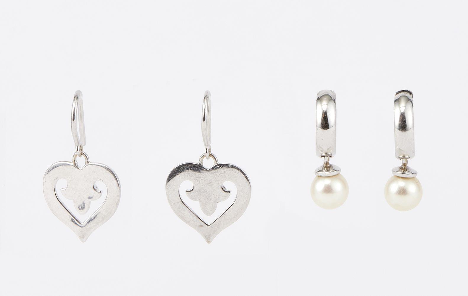 Or gris 750, H 2,5 cm, 3 g. On joint une paire de créoles retenant une perle, or gris 750, H 2 cm, poids brut 4 g.