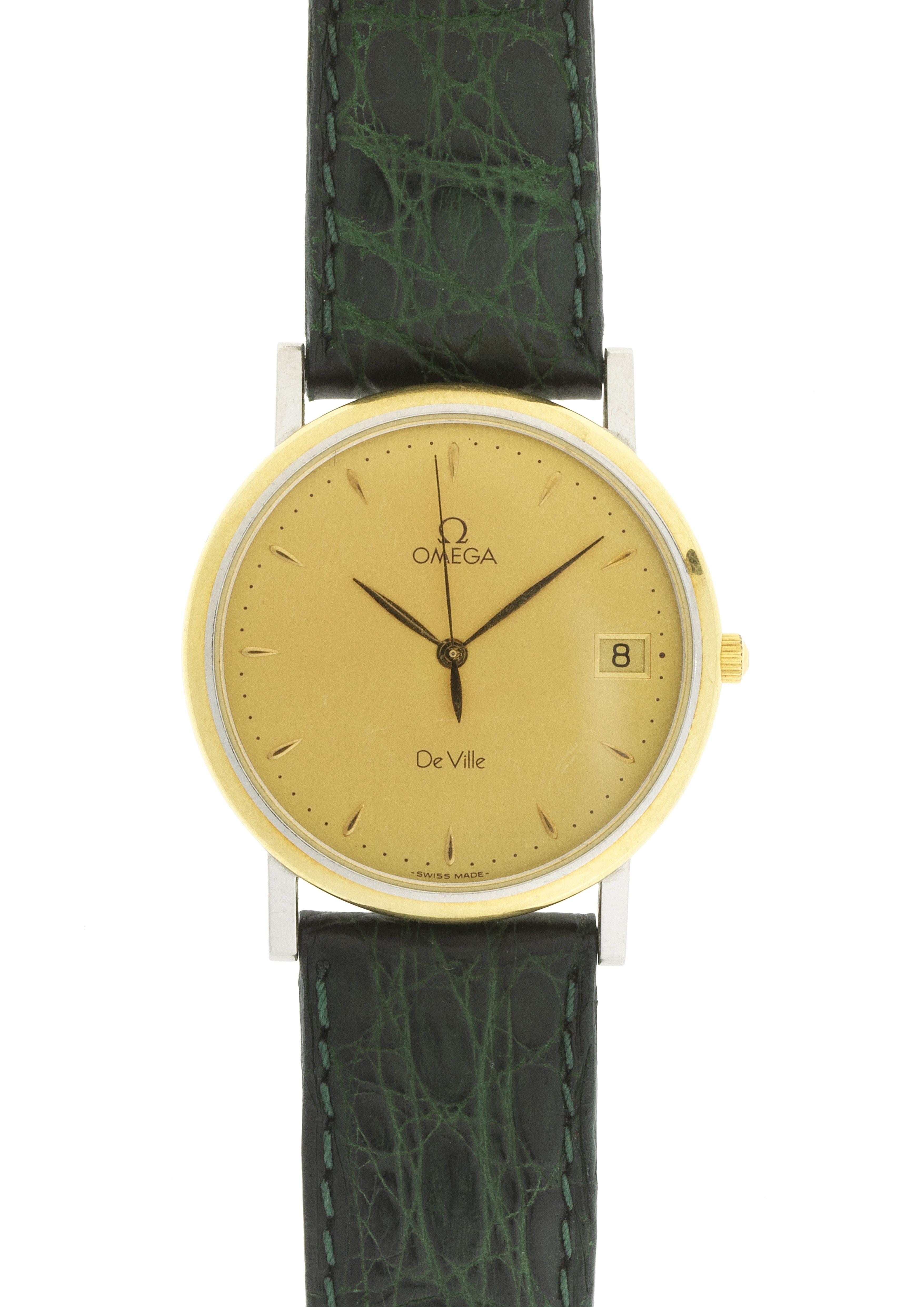 Cadran doré, aiguilles et index bâtons dorés, date à guichet à 3h, acier et métal doré, D 32 mm