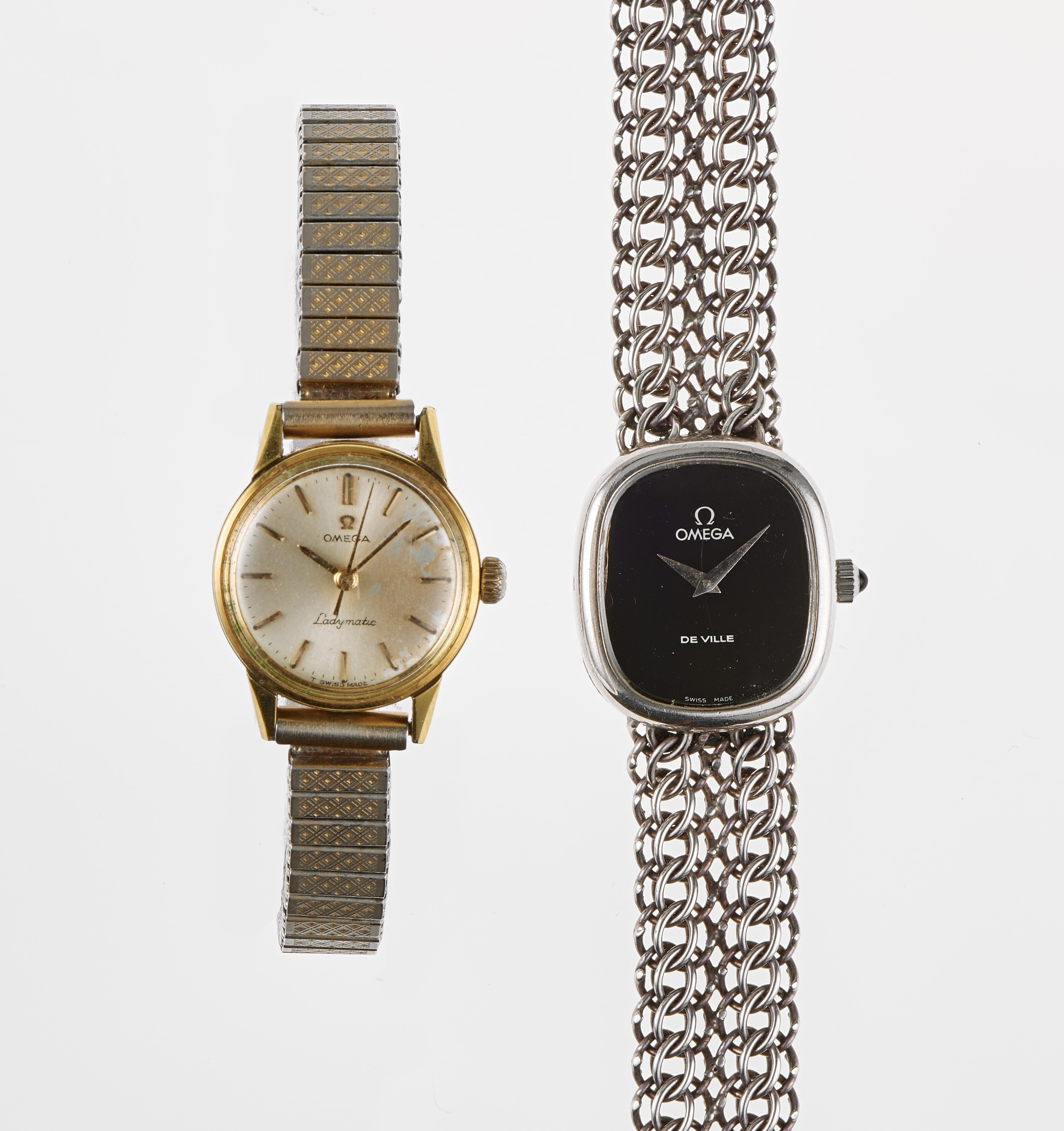 Cadran noir, aiguilles argentées, remontoir serti d'un onyx, argent 925, 26x23 mm, L 18,5 cm. On joint une montre bracelet Oméga ronde mécanique, cadran gris, aiguilles et index bâtons dorés, métal et métal doré, D 22 mm.