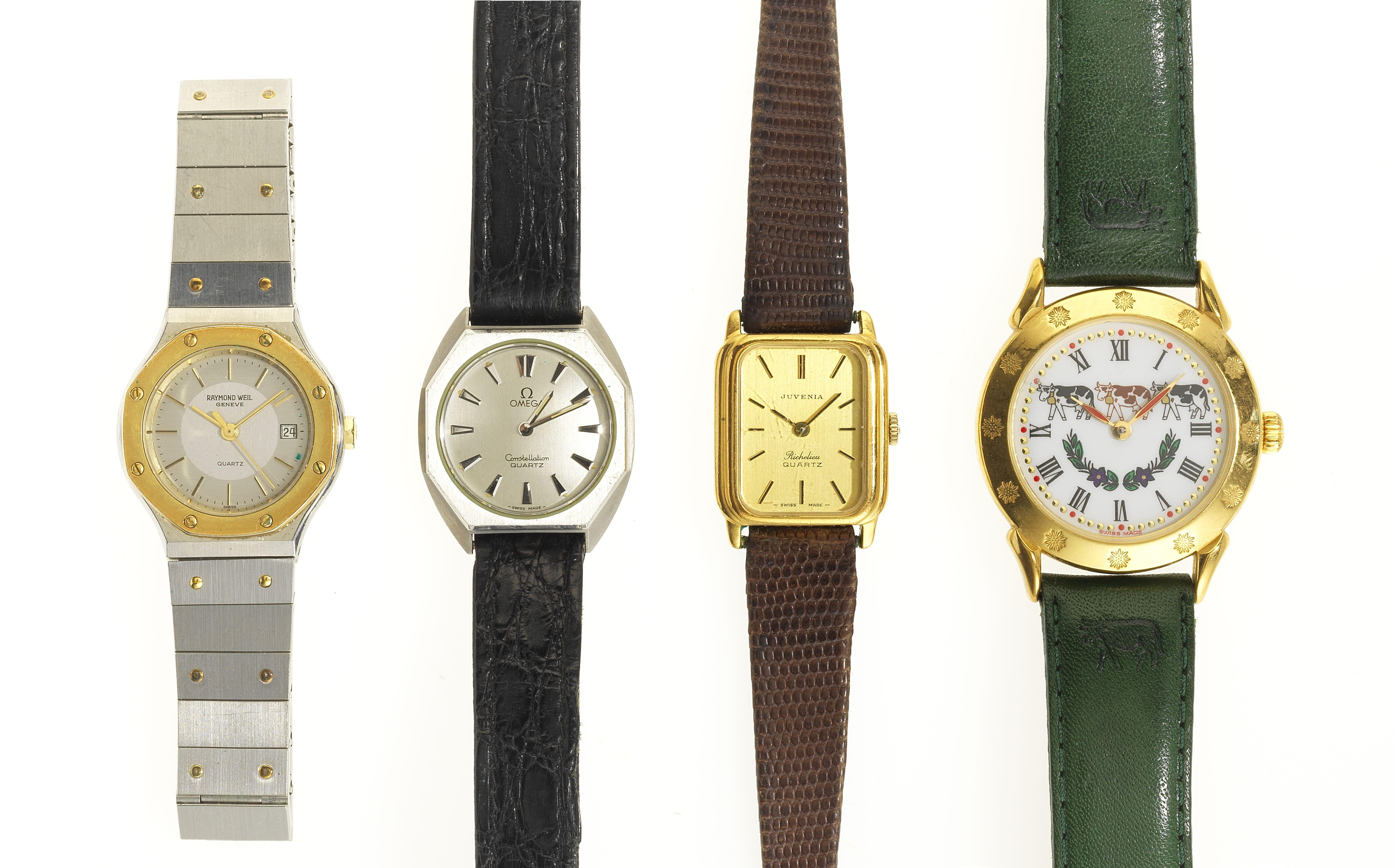 La première, Constellation, cadran, aiguilles et index bâtons argentés, acier, 23x23 mm, la seconde, aiguilles et index bâtons doré, date à guichet à 3h, métal doré et acier, 24x24 mm. On joint une montre Juvenia Richelieu rectangulaire, 22x20 mm (ne démarre pas) et une montre ronde à décor de vaches, D 34 mm.