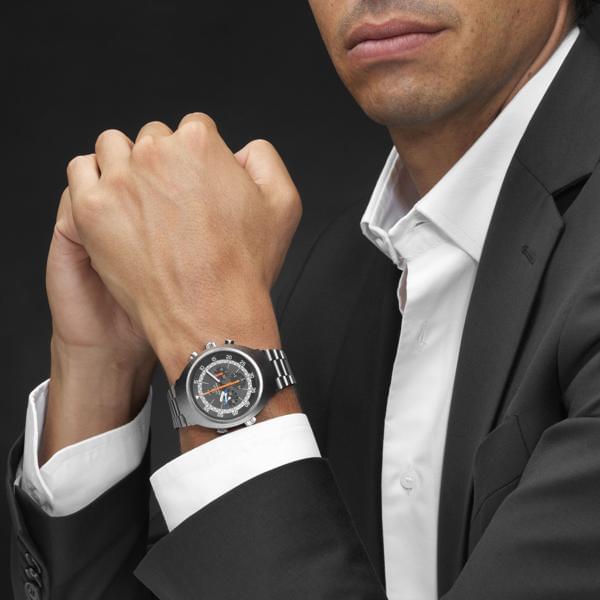 Cadran anthracite, chiffres arabes blancs, aiguilles blanches, orange et bleues, réf. 145.026, acier, D 42 mm