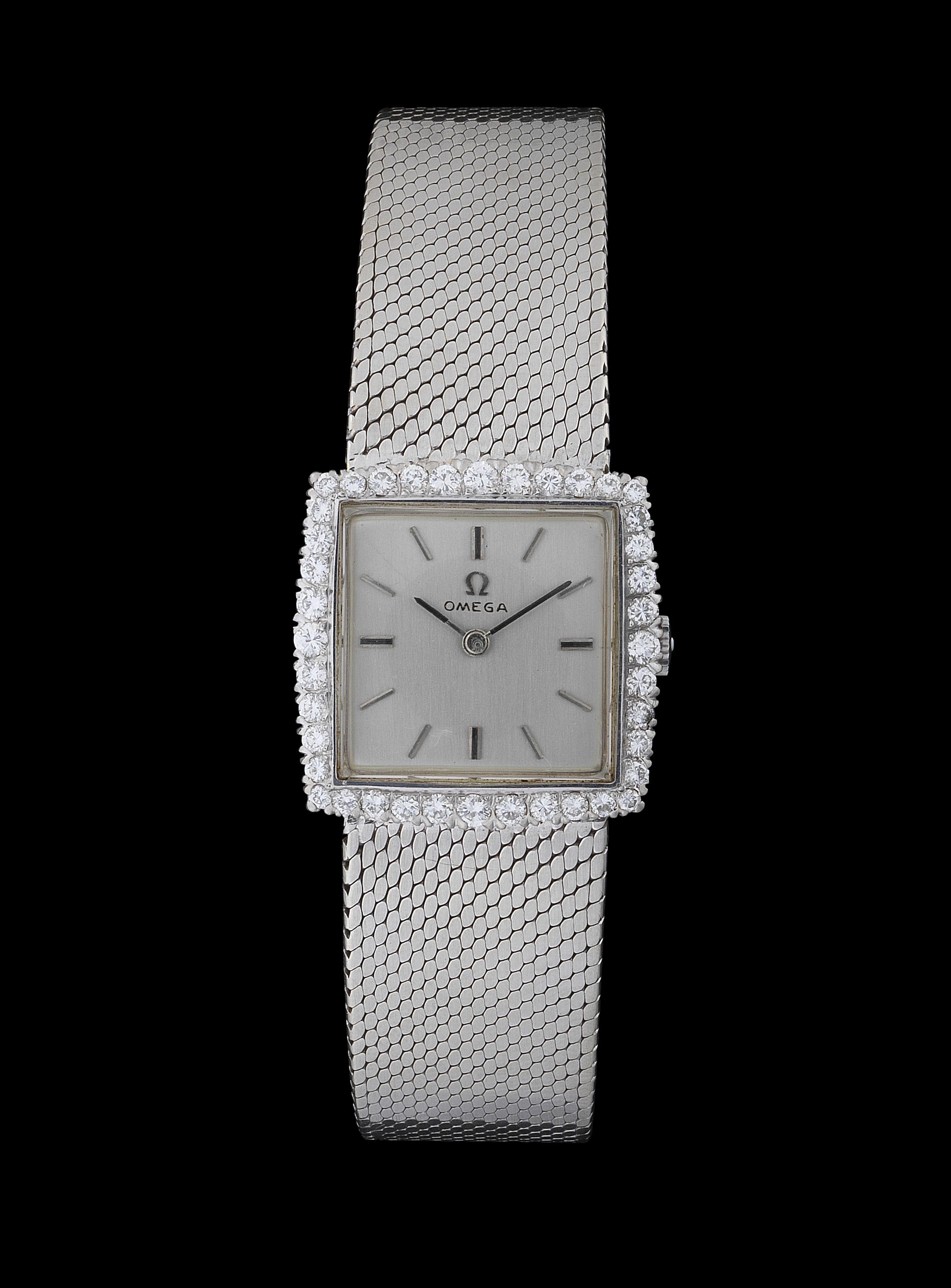 153. Omega, De Ville, montre-bracelet carrée mécanique sertie de diam...