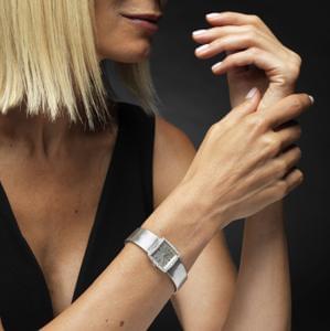 Cadran argent, aiguilles noires, or gris 750, 23x23 mm, L 15,5 c...