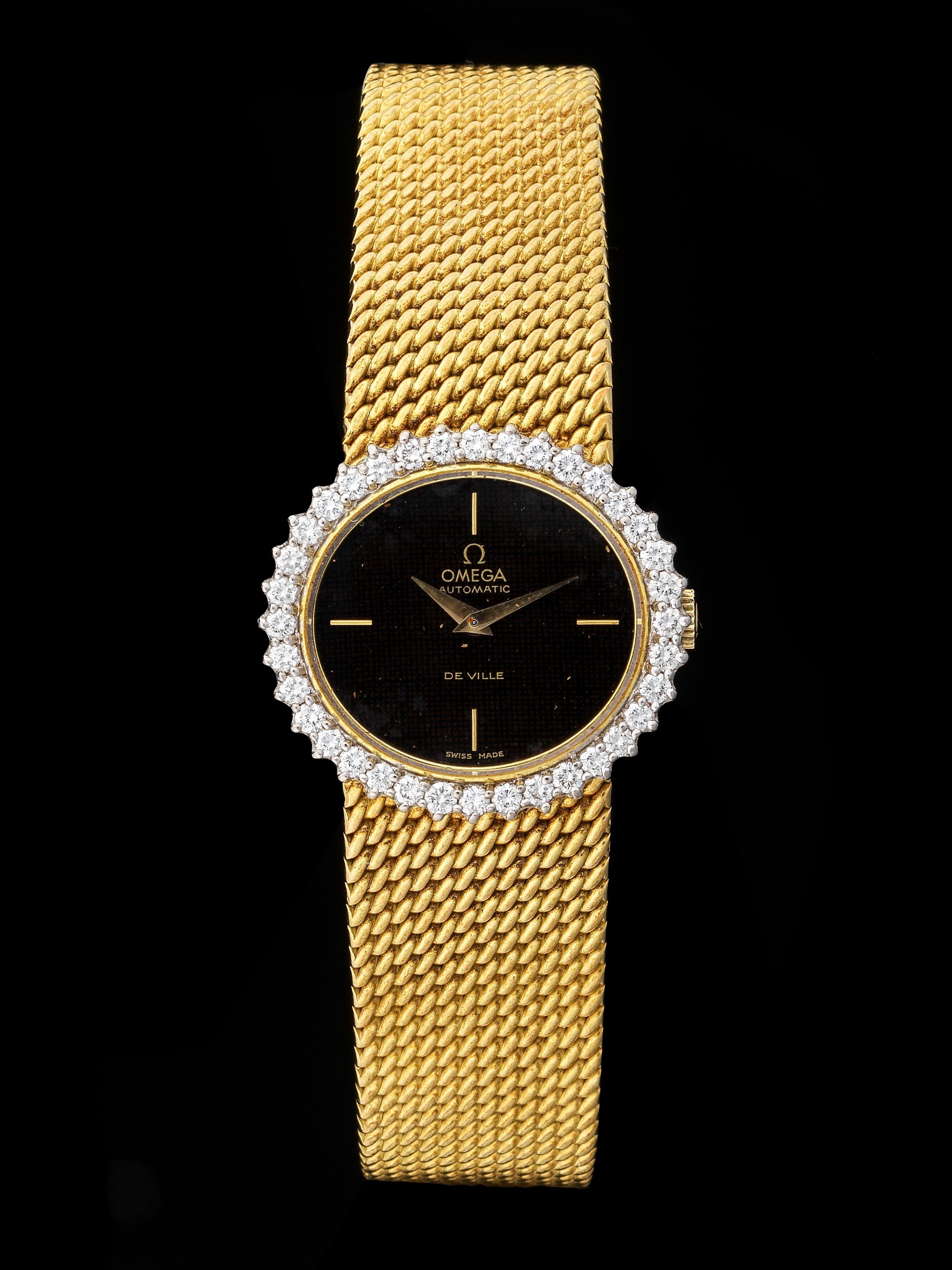 1. Omega, montre-bracelet ronde mécanique entièrement pavée de diam...