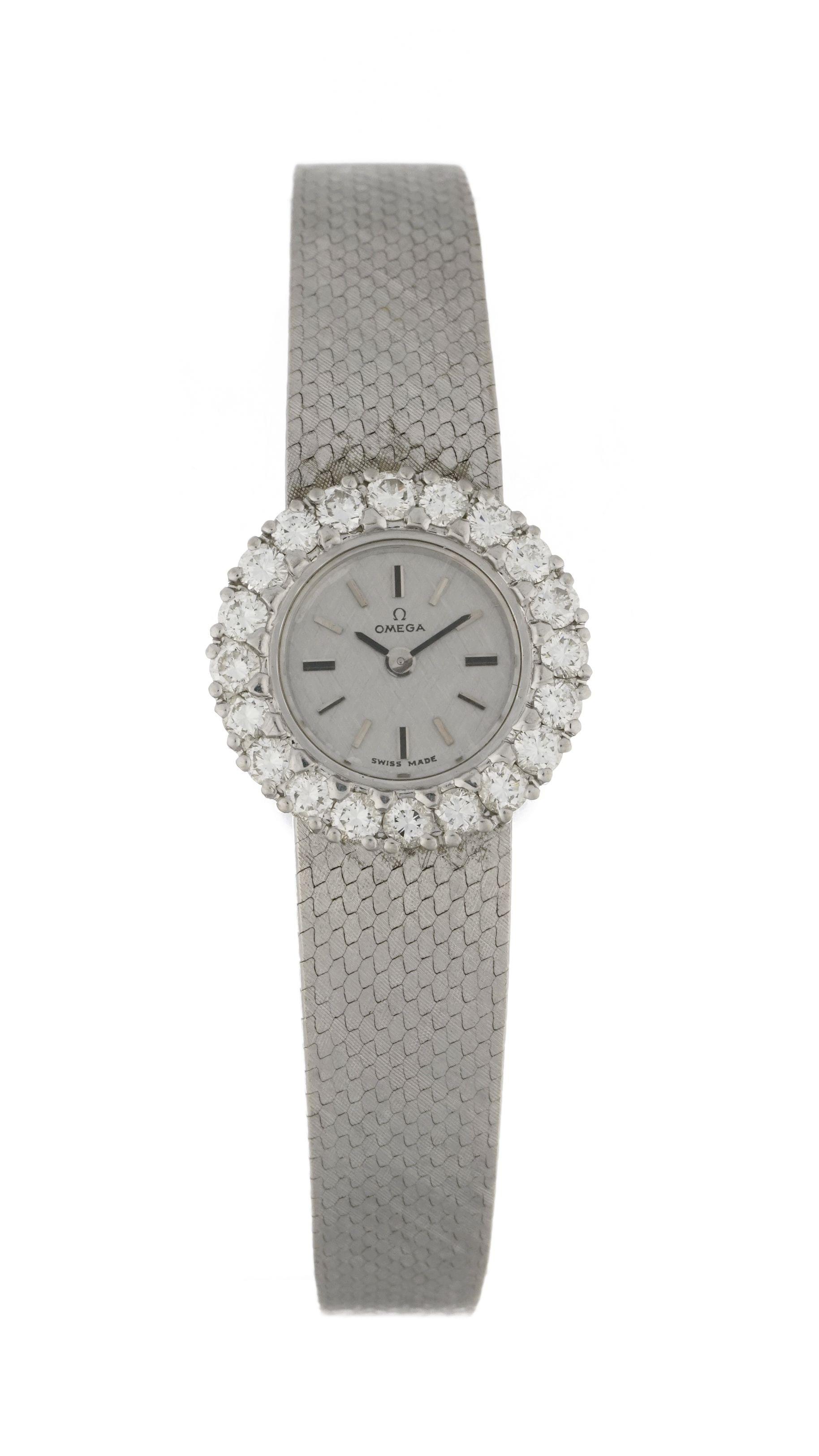 614. Omega, montre bracelet ronde mécanique sertie de diamants (env. 1 ct)