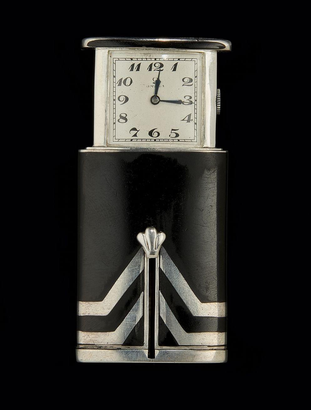 Cadran gris, aiguilles bleues, chiffres arabes noirs, argent 925 et laque noire, H 50 mm