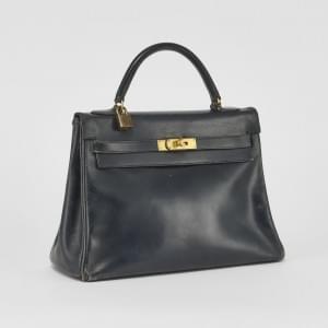 Cuir lisse bleu marine, garniture en métal doré, 23x32x12 cm