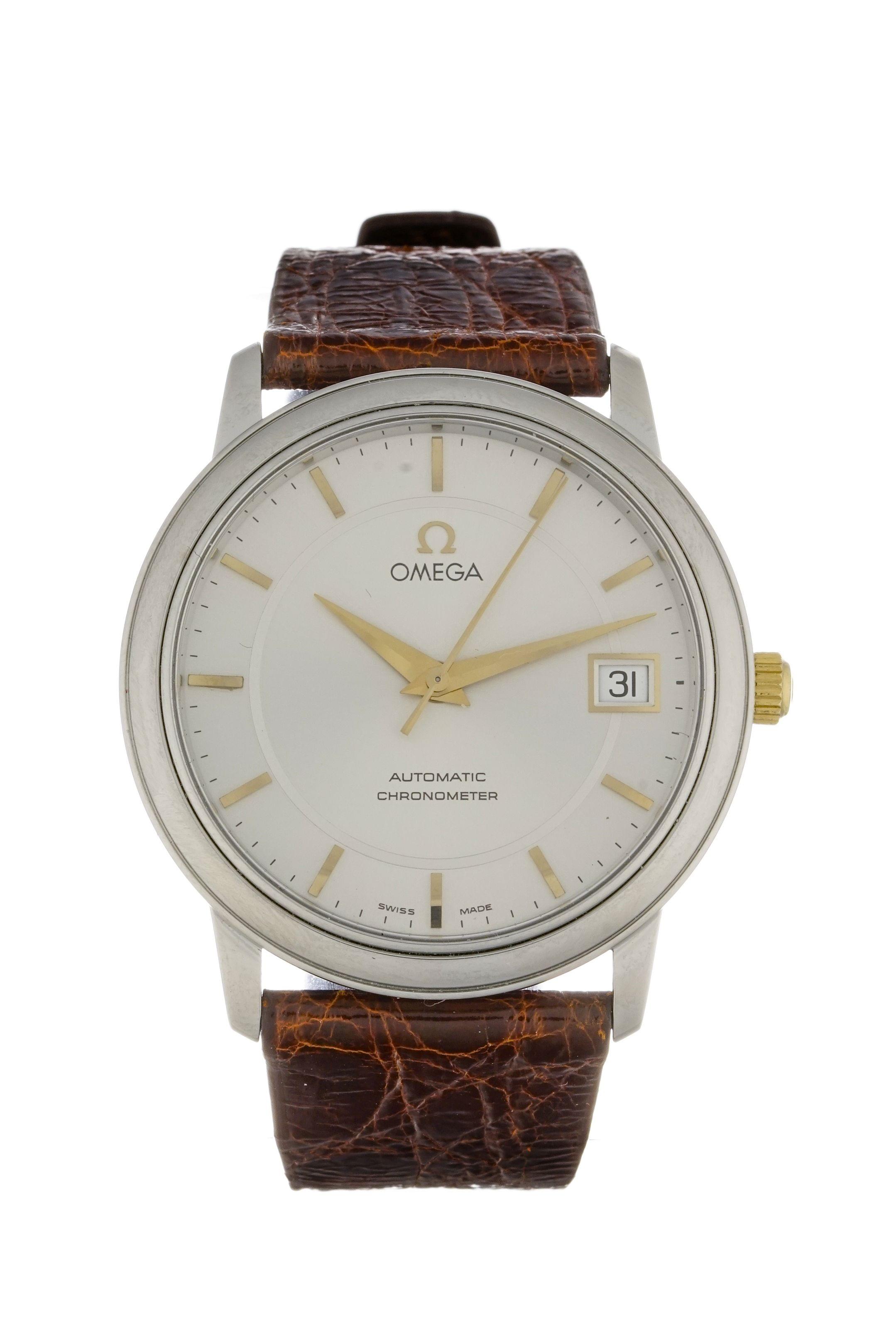 Cadran argenté, aiguilles et index bâtons dorés, date à guichet à 3h, bracelet Universal marron, acier, D 34 mm