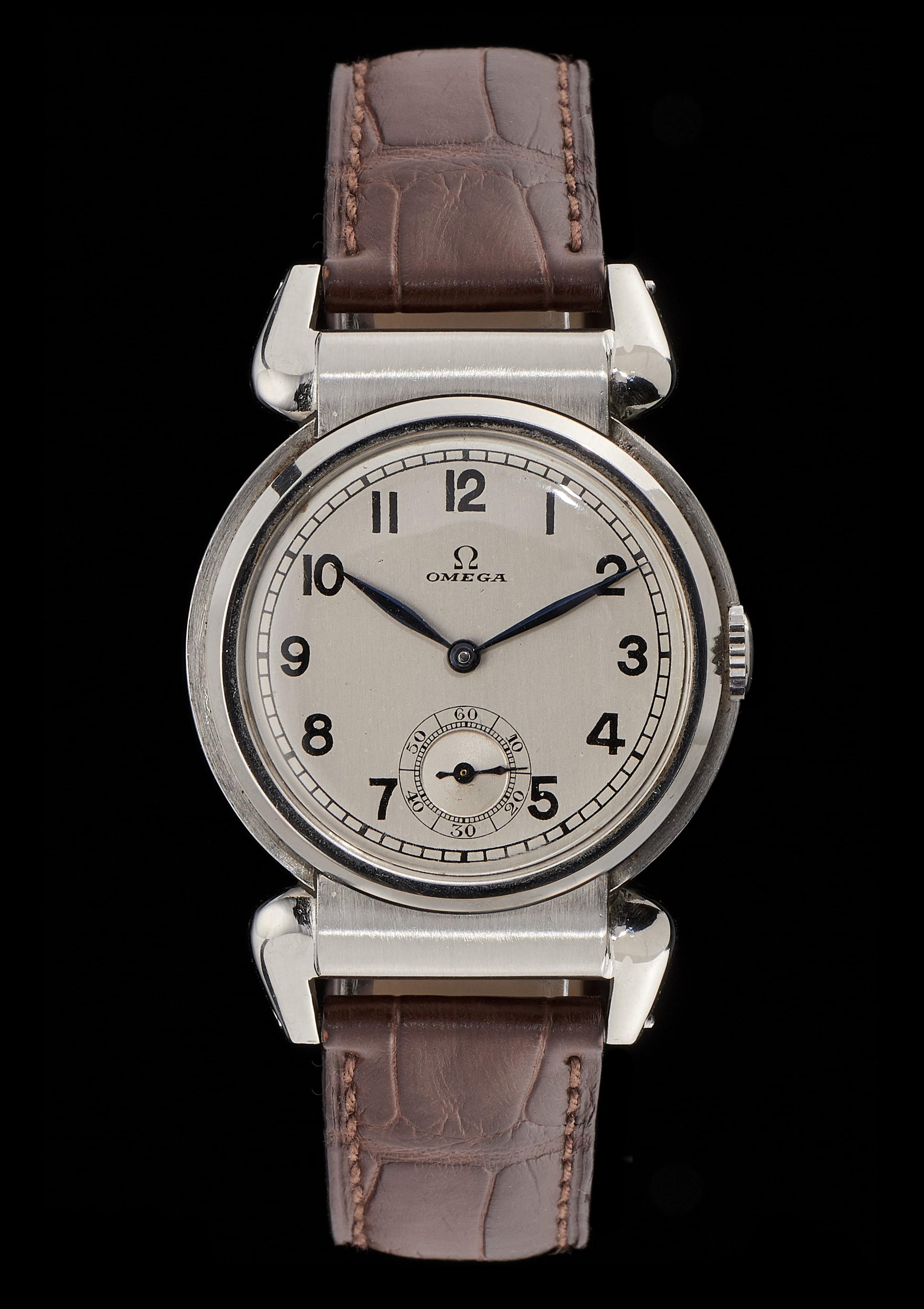Cadran argenté, chiffres arabes noirs, aiguilles bleues, secondes à 6h, acier, D 35 mm