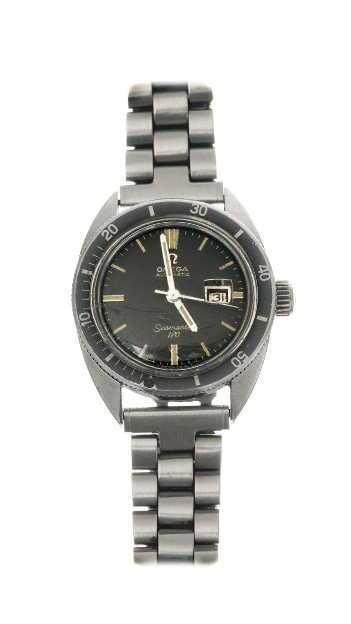 Cadran noir, aiguilles argentées luminescentes, index bâtons dorés, date à guichet à 3h, acier, D 24 mm